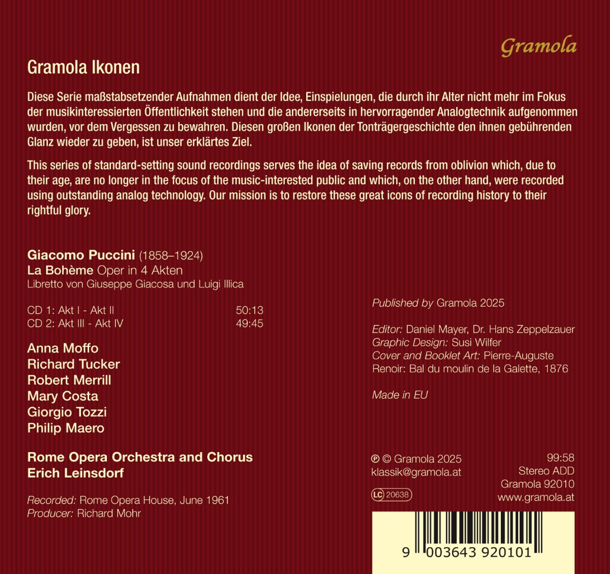 Giacomo Puccinis »La Bohème« mit Anna Moffo, Richard Tucker, Robert Merrill und Mary Costa sowie dem Orchester und Chor der Oper Rom unter der Leitung von Erich Leinsdorf. Eine der letzten auf höchstem technischen und künstlerischen Niveau erhältlichen CD-Einspielungen.