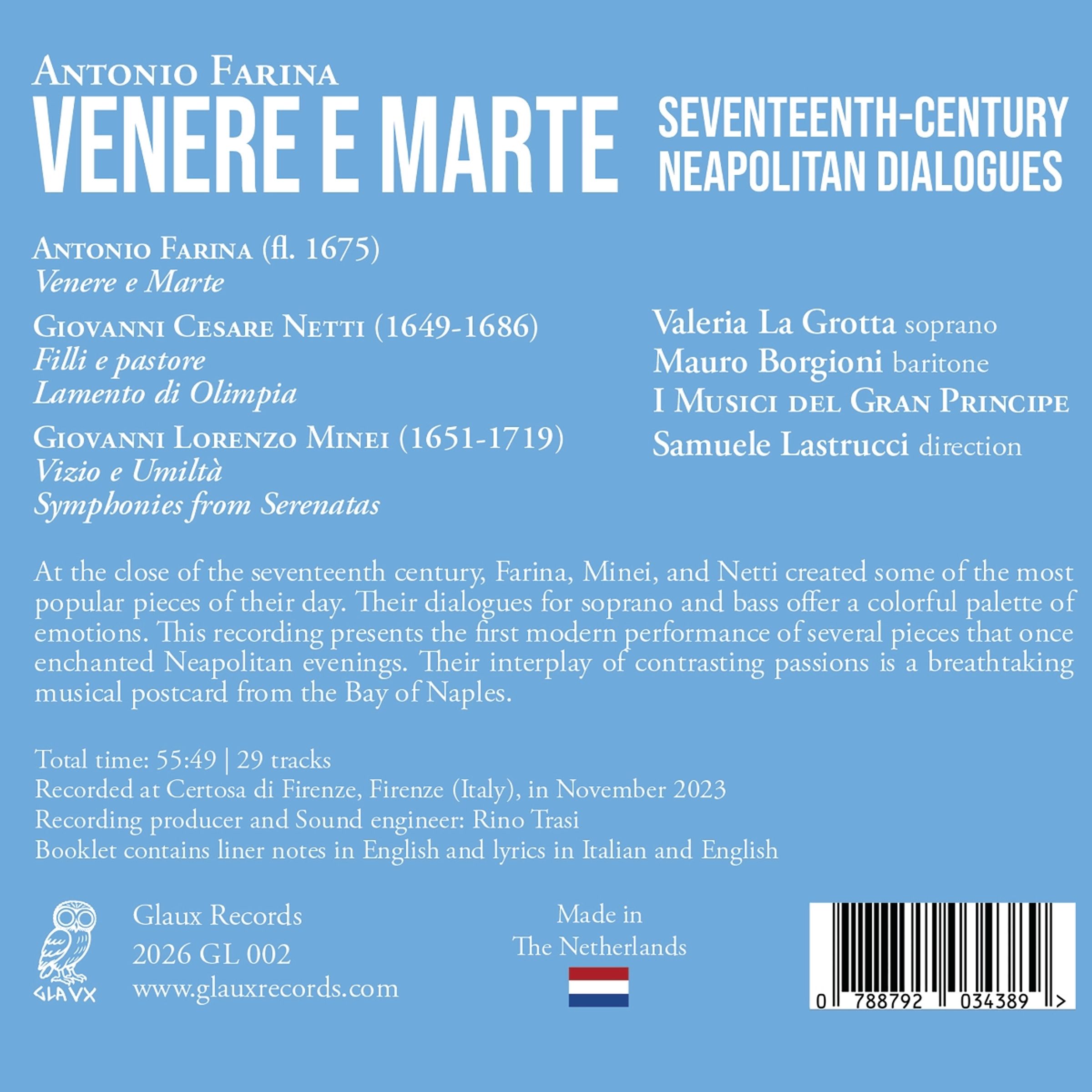 Am Ende des 17. Jahrhunderts schufen Antonio Farina, Giovanni Lorenzo Minei und Giovanni Cesare Netti einige der beliebtesten Werke ihrer Zeit. Ihre Dialoge für Sopran und Bass bieten eine farbenfrohe Palette an Emotionen. Diese Aufnahme präsentiert die erste moderne Aufführung mehrerer Stücke, die einst die neapolitanischen Abende verzauberten. Ihr Wechselspiel kontrastierender Leidenschaften ist eine atemberaubende musikalische Postkarte aus der Bucht von Neapel. Die Sopranistin Valeria La Grotta und der Bariton Mauro Borgioni, die diese wiederentdeckten Präziosen aufnahmen, gehören zu einer neuen Generation italienischer Barocksänger.