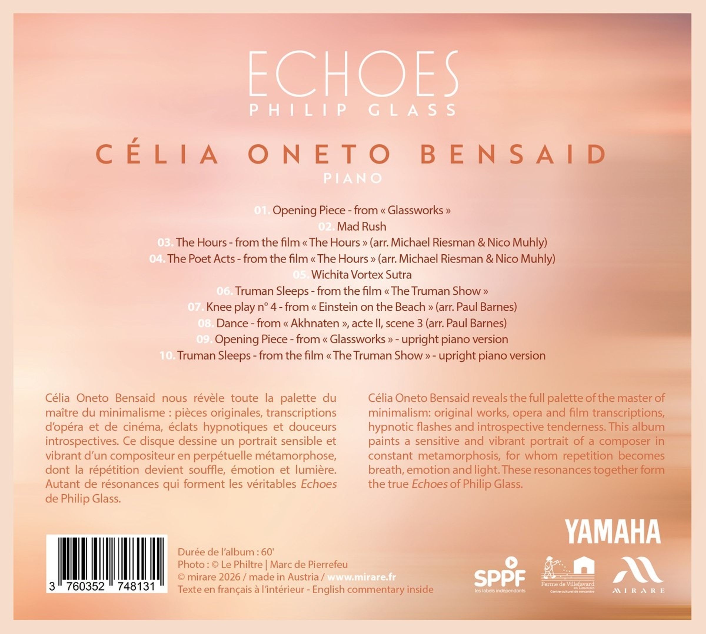 Célia Oneto Bensaid offenbart uns die ganze Bandbreite des Meisters des Minimalismus: Originalkompositionen, Opern- und Filmmusiktranskriptionen, hypnotische Ausbrüche und introspektive Sanftheit. Diese LP zeichnet ein sensibles und lebendiges Porträt eines Komponisten in ständiger Wandlung, dessen Wiederholungen zu Atem, Emotion und Licht werden. All diese Resonanzen bilden die wahren Echoes von Philip Glass