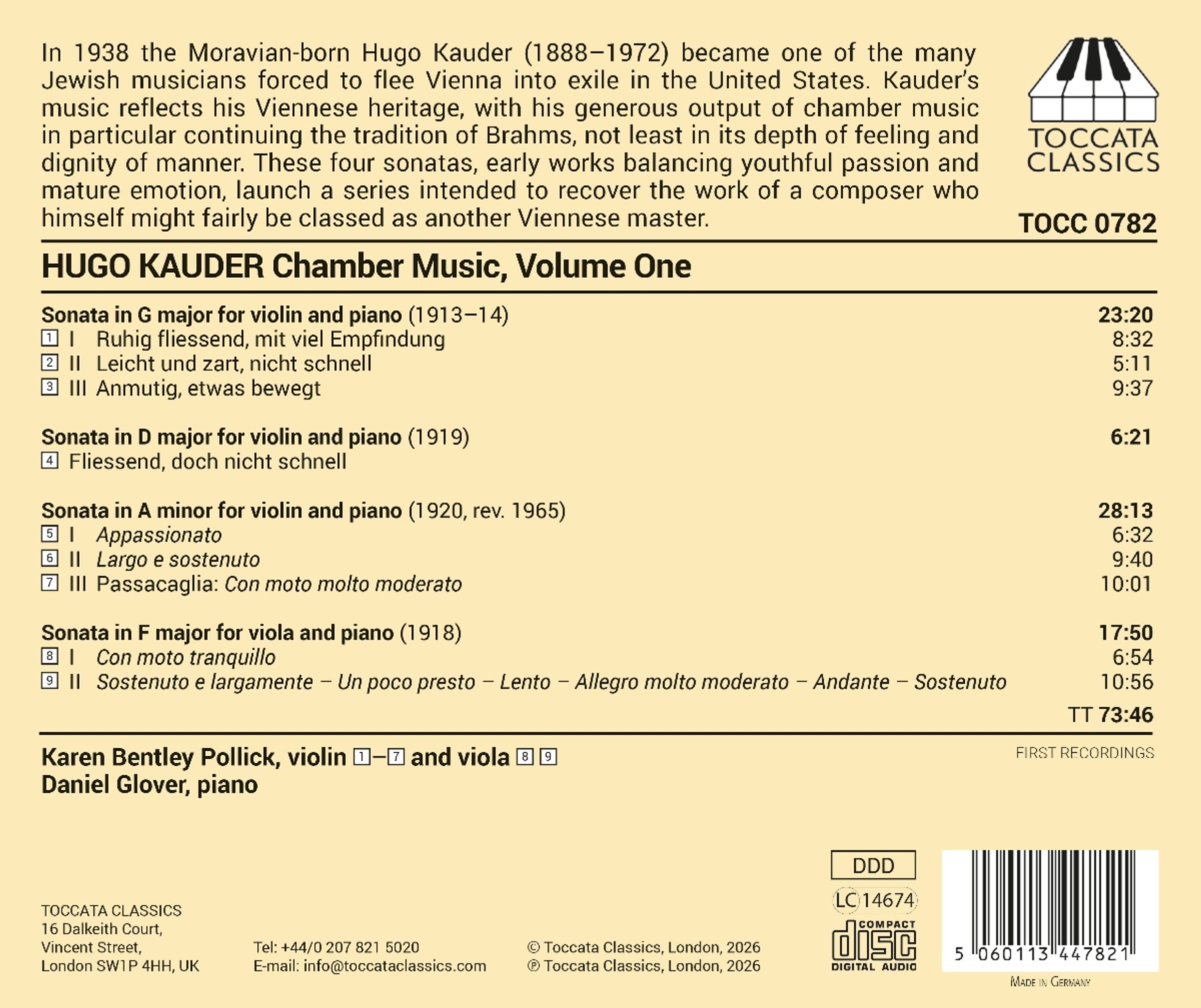 Der in Mähren geborene Hugo Kauder (1888-1972) gehörte 1938 zu den vielen jüdischen Musikern, die aus Wien ins amerikanische Exil fliehen mussten. In Kauders Musik spiegelt sich sein Wiener Erbe wider, wobei sein großzügiges kammermusikalisches Schaffen vor allem die Tradition von Brahms fortsetzt, nicht zuletzt in seiner Gefühlstiefe und Würde. Diese vier Sonaten, frühe Werke, in denen sich jugendliche Leidenschaft und reife Emotionen die