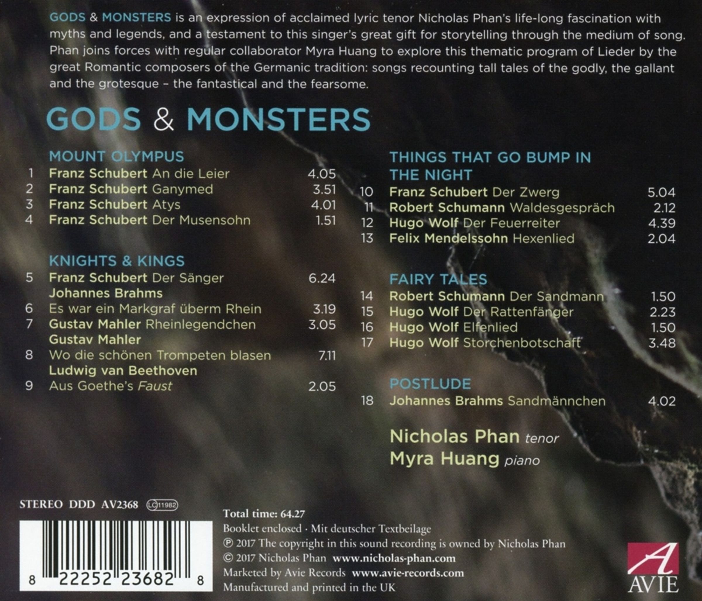 Der Tenor Nicholas Phan hat sich – in Begleitung der Pianistin Myra Huang – mit dieser Aufnahme einen Lebenstraum erfüllt: Das Album Gods & Monsters, welches sich ganz den Mythen und Legenden verschrieben hat und Werke großer österreichischer und deutscher Komponisten der Romantik zusammenführt, die sich mit den fantastischen Kreaturen der germanischen Mythenwelt befassen. Präsentiert werden Beethoven, Mahler, Mendelssohn, Schubert, Schumann und Wolf.