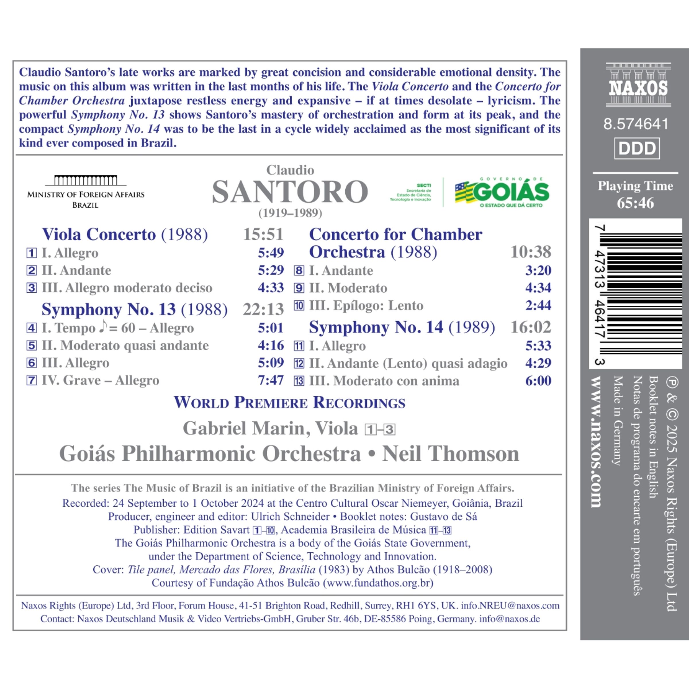 Claudio Santoros Spätwerke zeichnen sich durch große Prägnanz und eine beachtliche emotionale Dichte aus. Die Musik auf diesem Album entstand in den letzten Monaten seines Lebens. Das Violakonzert und das Konzert fur Kammerorchester verbinden unruhige Energie mit expansiver – und manchmal trostloser – Lyrik. Die kraftvolle Sinfonie Nr. 13 zeigt Santoros Meisterschaft in Orchestrierung und Form auf dem Höhepunkt, und die kompakte Sinfonie Nr. 14 sollte die letzte eines Sinfonie-Zyklus’ sein, der weithin zu den bedeutendsten seiner Art in Brasilien gilt. Diese Veröffentlichung ist Teil eines laufenden Projekts mit Aufnahme aller Sinfonien von Claudio Santoro. Die bisherigen Teile wurden von der Presse hochgelobt, sowohl die Darbietungen des Goias Philharmonic Orchestra unter seinem Chefdirigenten Neil Thomson als auch Santoros herausragende Fähigkeiten als Sinfoniker.