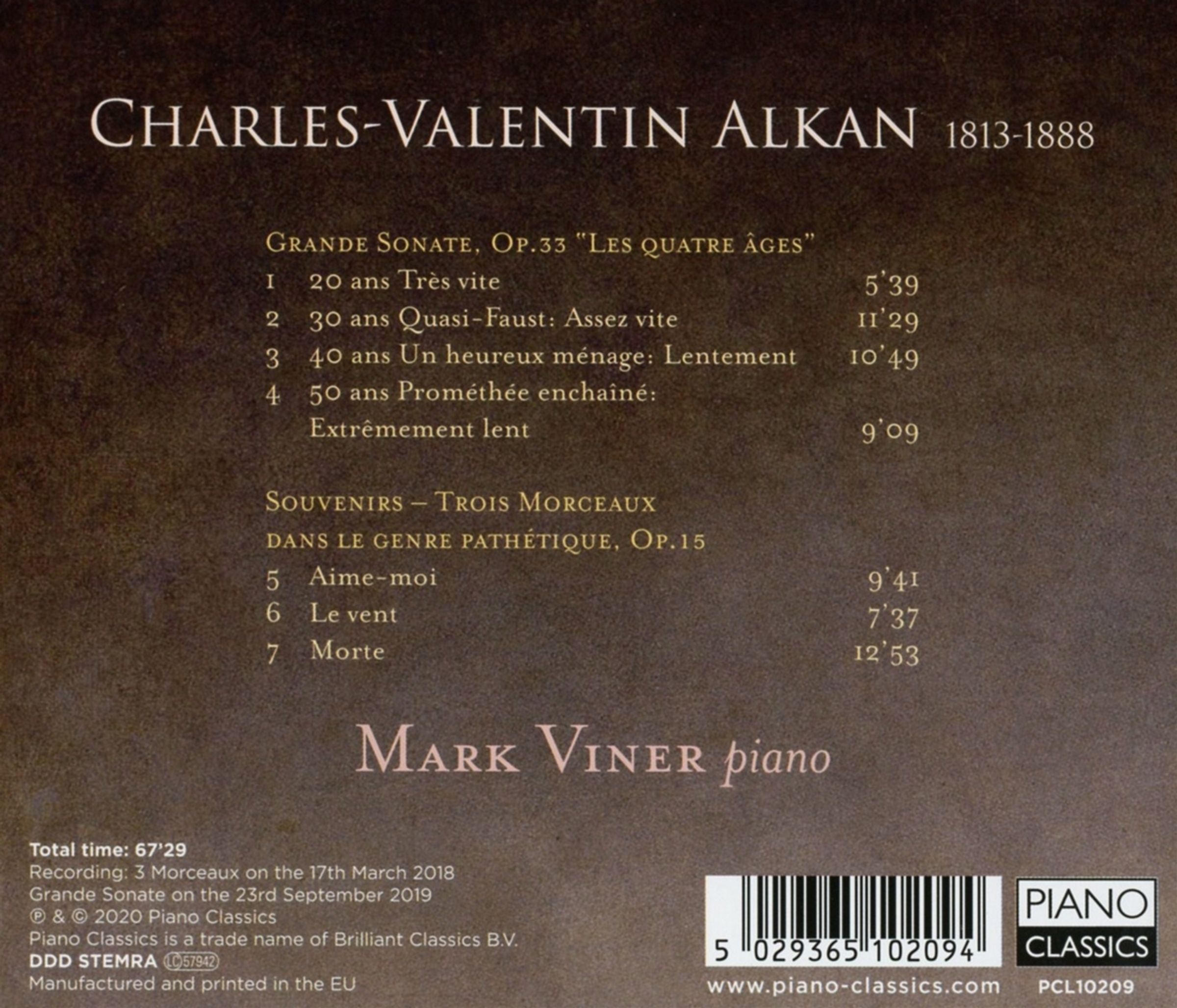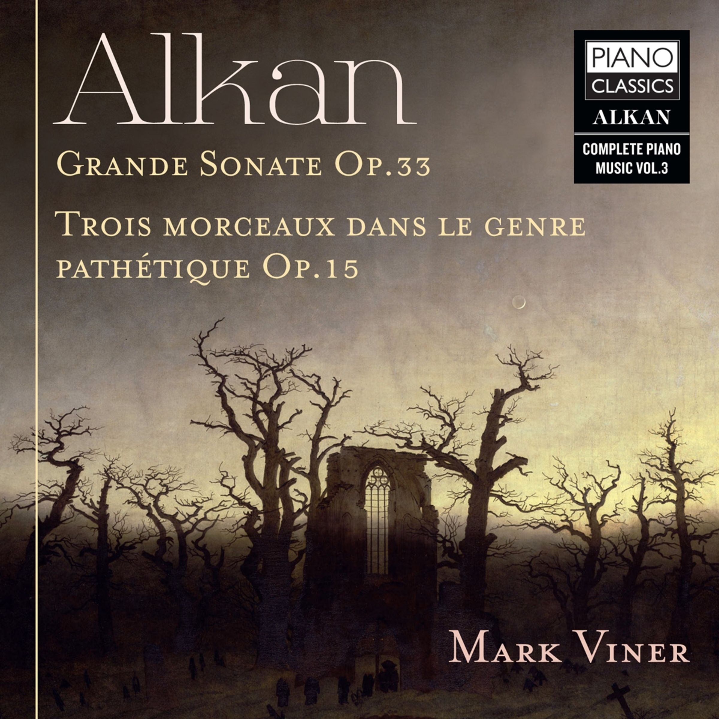 Der britische Pianist Mark Viner setzt sein Alkan-Projekt mit einer neuen Aufnahme der gewaltigen Grande Sonate ‚Les quatre âges’ op. 33 und den 3 Morceaux dans le Genre pathétique von Alkan (1813-1888) fort. In der Grande Sonate beschreibt er in vier Sätzen musikalisch die verschiedenen Phasen des menschlichen Lebens, von der überschwänglichen Jugend bis hin zum tragischen Alter; die drei Morceaux sind höchst eigenständige Tondichtungen, die erste erinnert an ein Liebesgedicht, die zweite an den heulenden Winterwind, und die dritte Morte an einen Spukfriedhof – mit frappierend voraushörenden Anklängen an Ravels Le Gibet.