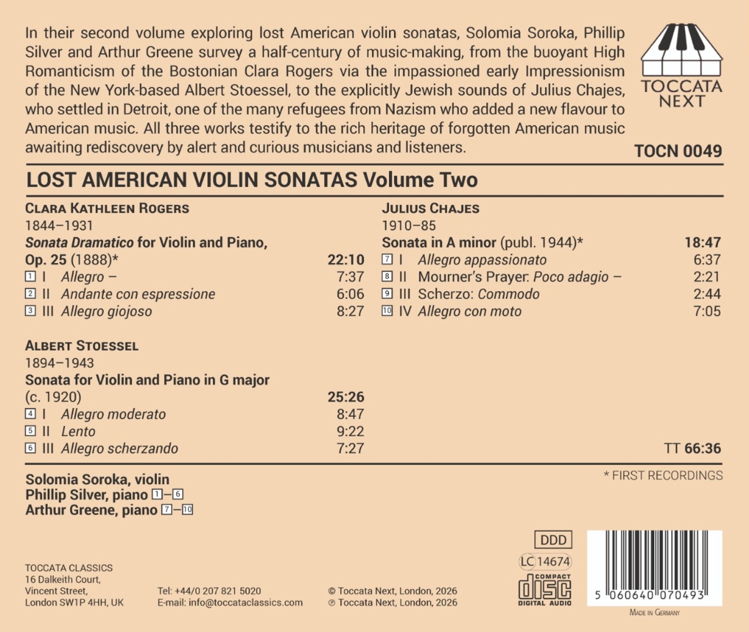 In dem zweiten Teil, der sich mit verlorenen amerikanischen Violinsonaten befasst, geben Solomia Soroka (Violine), Phillip Silver und Arthur Greene (beide Klavier) einen Überblick über ein halbes Jahrhundert Musikschaffen, von der beschwingten Hochromantik der Bostonerin Clara Rogers über den leidenschaftlichen frühen Impressionismus des in New York lebenden Albert Stoessel bis hin zu den explizit jüdischen Klängen von Julius Chajes, der sich in Detroit niederließ und als einer von vielen Flüchtlingen vor dem Nationalsozialismus der amerikanischen Musik eine neue Note verlieh. Alle drei Werke zeugen vom reichen Erbe vergessener amerikanischer Musik, das darauf wartet, von aufmerksamen und neugierigen Musikern und Zuhörern wiederentdeckt zu werden. Bei den Werken von Clara Kathleen Rogers und Julius Chajes handelt es sich um Weltersteinspielungen.