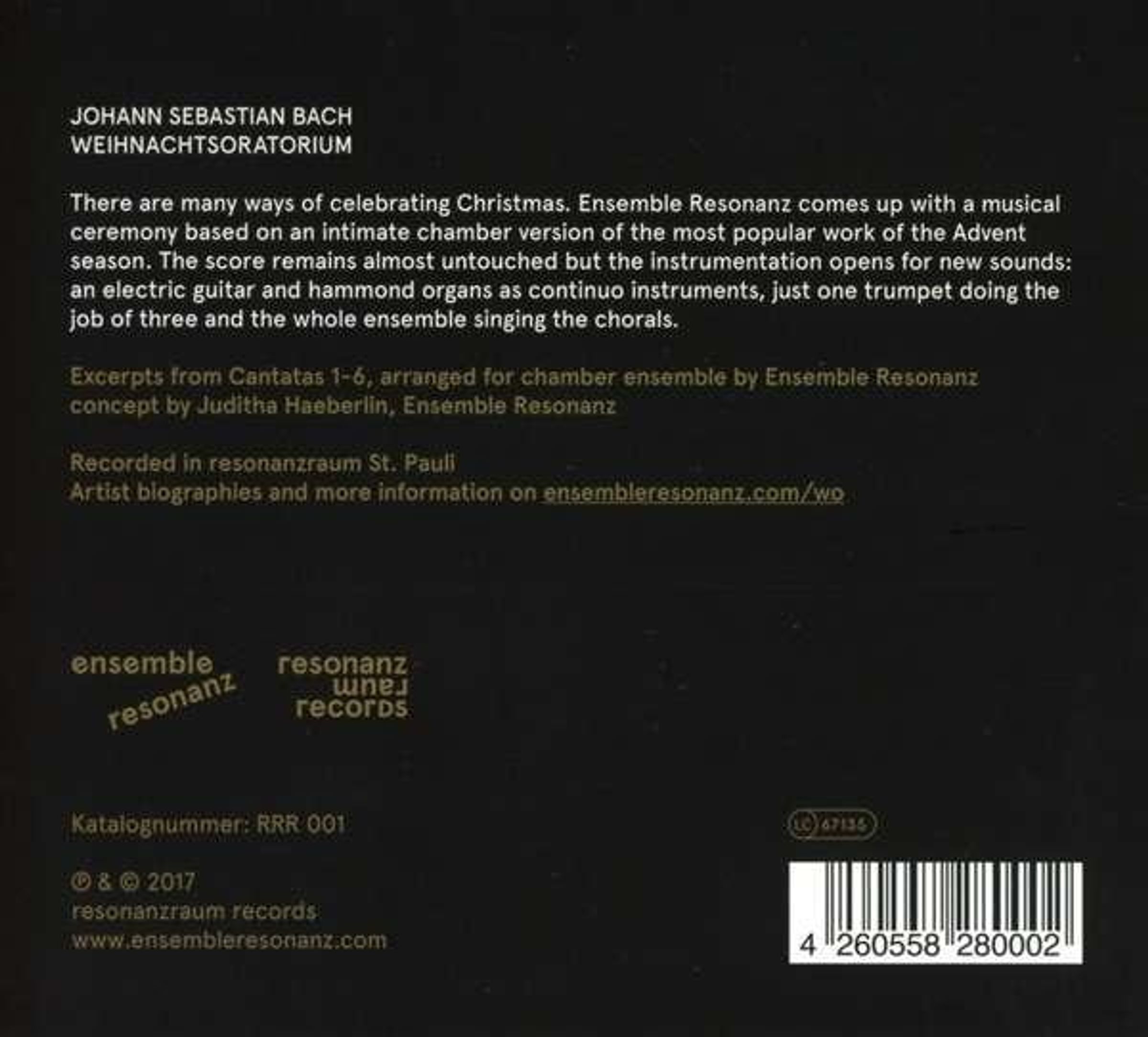 Das Ensemble Resonanz präsentiert ein Herzensprojekt der Musiker auf CD: Bachs Weihnachtsoratorium als urbane Kammermusik. Ohne großen Chor und in kleiner Besetzung holt das weltweit gefragte Ensemble das Werk zu sich unter den Tannenbaum. Von »Jauchzet, frohlocket!“ über »Bereite Dich Zion« bis »Ich steh an Deiner Krippen hier« – 30 Chöre, Arien, Rezitative und Choräle des Bach’schen Meisterwerks sind in einer eigenen und besonderen Bearbeitung zusammengestellt: Hammondorgel und E-Gitarre bringen neue Klangfarben ins Continuo, eine Trompete macht den Job von dreien und in den Chorälen stimmen alle mit ein. Warum widmet sich ein Ensemble, das sich seinen Namen vor allem mit Raritäten alter und zeitgenössischer Musik erspielt hat, ausgerechnet dem erfolgreichsten Oratorium des Barock? »Weil Weihnachten ohne WO nur die halbe Wahrheit ist«, wäre die Antwort des Ensemble Resonanz. Nachdem es mit dem resonanzraum St. Pauli im Bunker an der Feldstraße seinen eigenen Kammermusiksaal eröffnet hatte, war es dann an der Zeit für eine eigene Version – als Hausmusik im 21. Jahrhundert. Mit seiner besonderen Spielfreude und künstlerischen Qualität zählt das Ensemble Resonanz zu den führenden Kammerorchestern weltweit. Die Programmideen setzten alte und neue Musik in lebendige Zusammenhänge und sorgen für Resonanz zwischen den Werken. In Hamburg bespielt das Ensemble mit der Elbphilharmonie und dem resonanzraum St. Pauli zwei besondere Orte. Die Residenz an der Elbphilharmonie beinhaltet die Konzertreihe »Resonanzen«. Im resonanzraum St. Pauli laden die Musiker monatlich zu der Konzertreihe »URBAN STRING« und sprechen ein junges Klassikpublikum an.