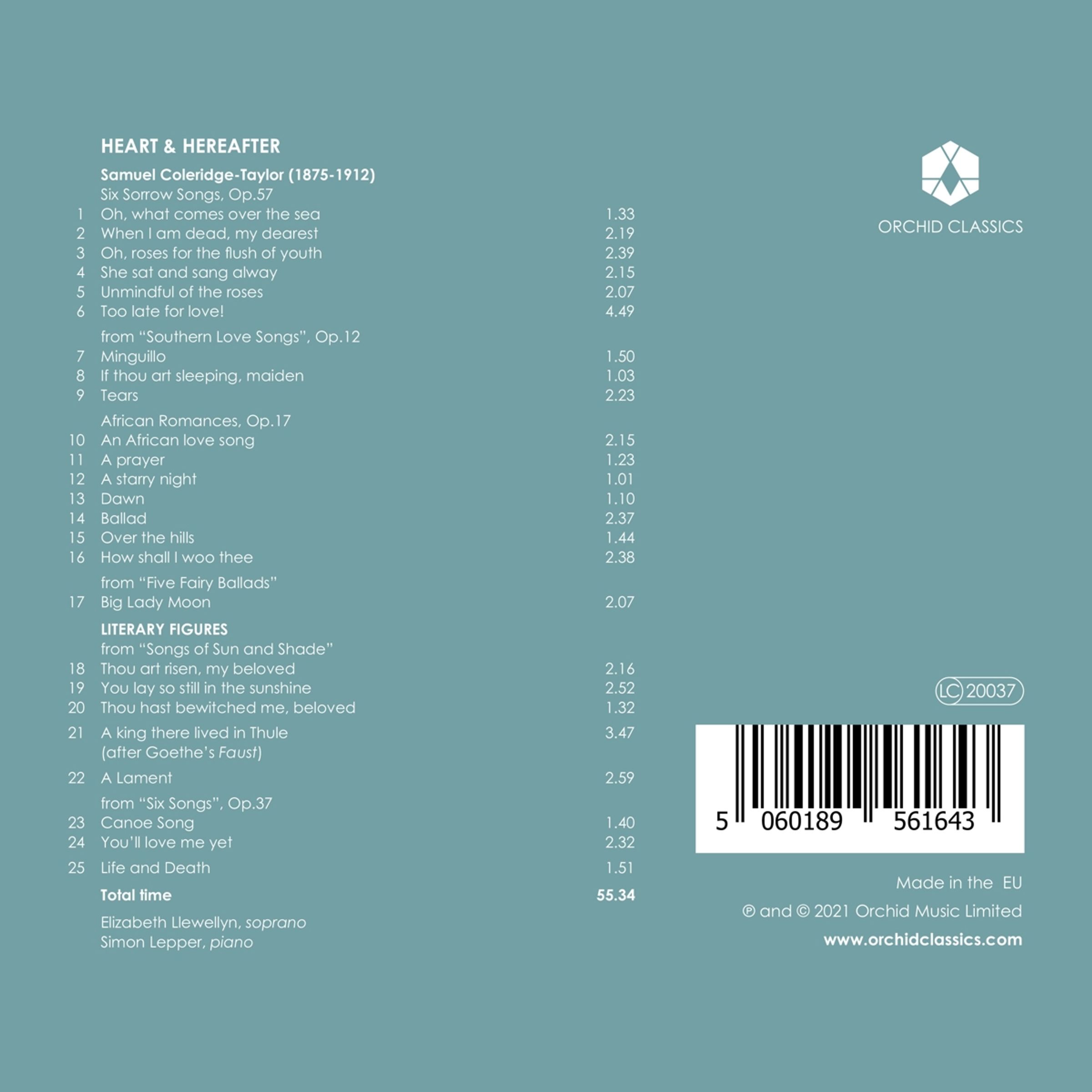 6 Sorrow Songs op. 57; Southern Love Songs" op. 12 (Ausz.); African Romances op. 17; Literary Figures from "Songs of Sun and Shade"; Big Ladfy Moon aus "Five Fairy Ballads"; A King there lived in Thule; A Lament; 6 Songs op. 37 (Ausz.); Life and Death