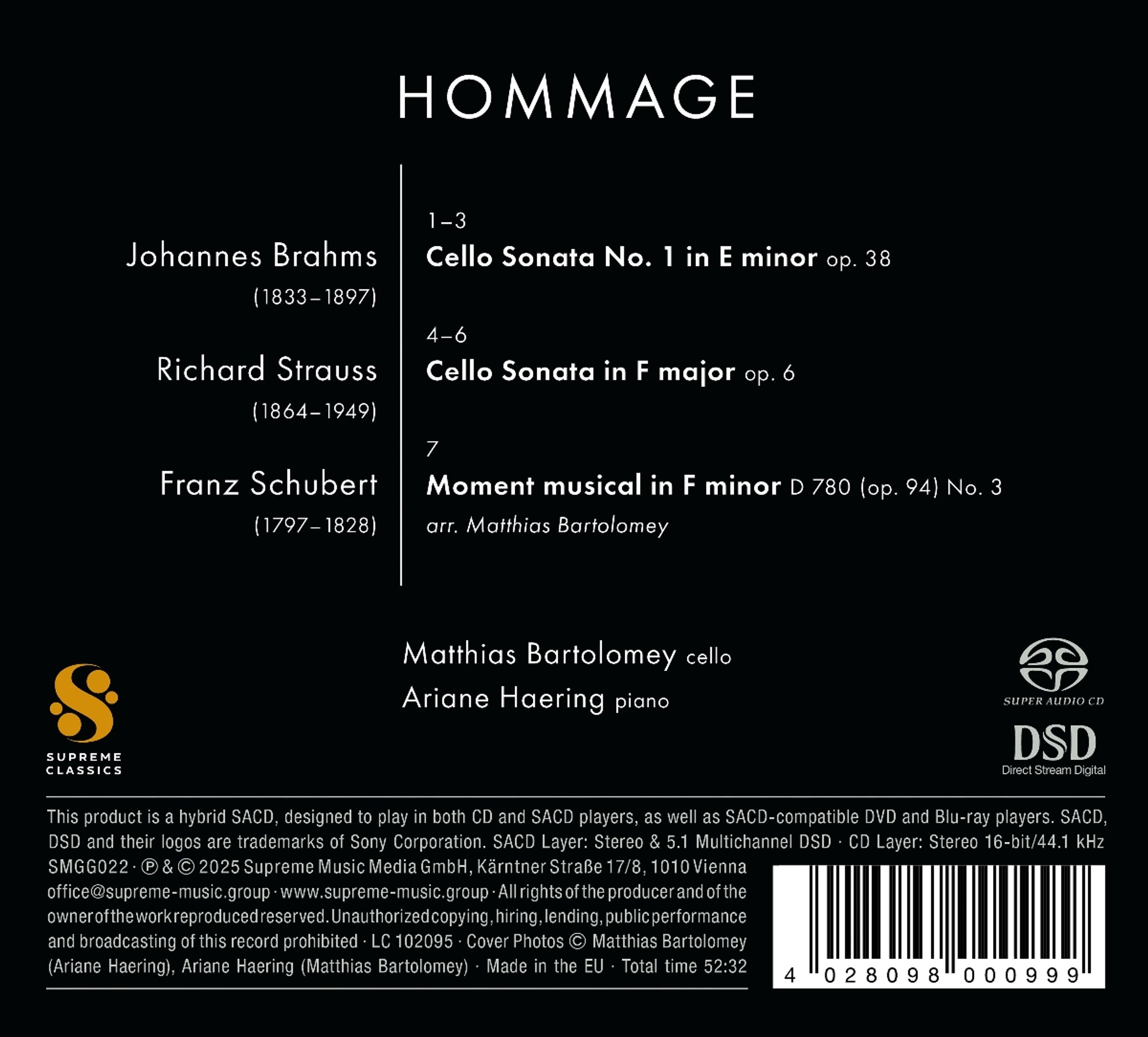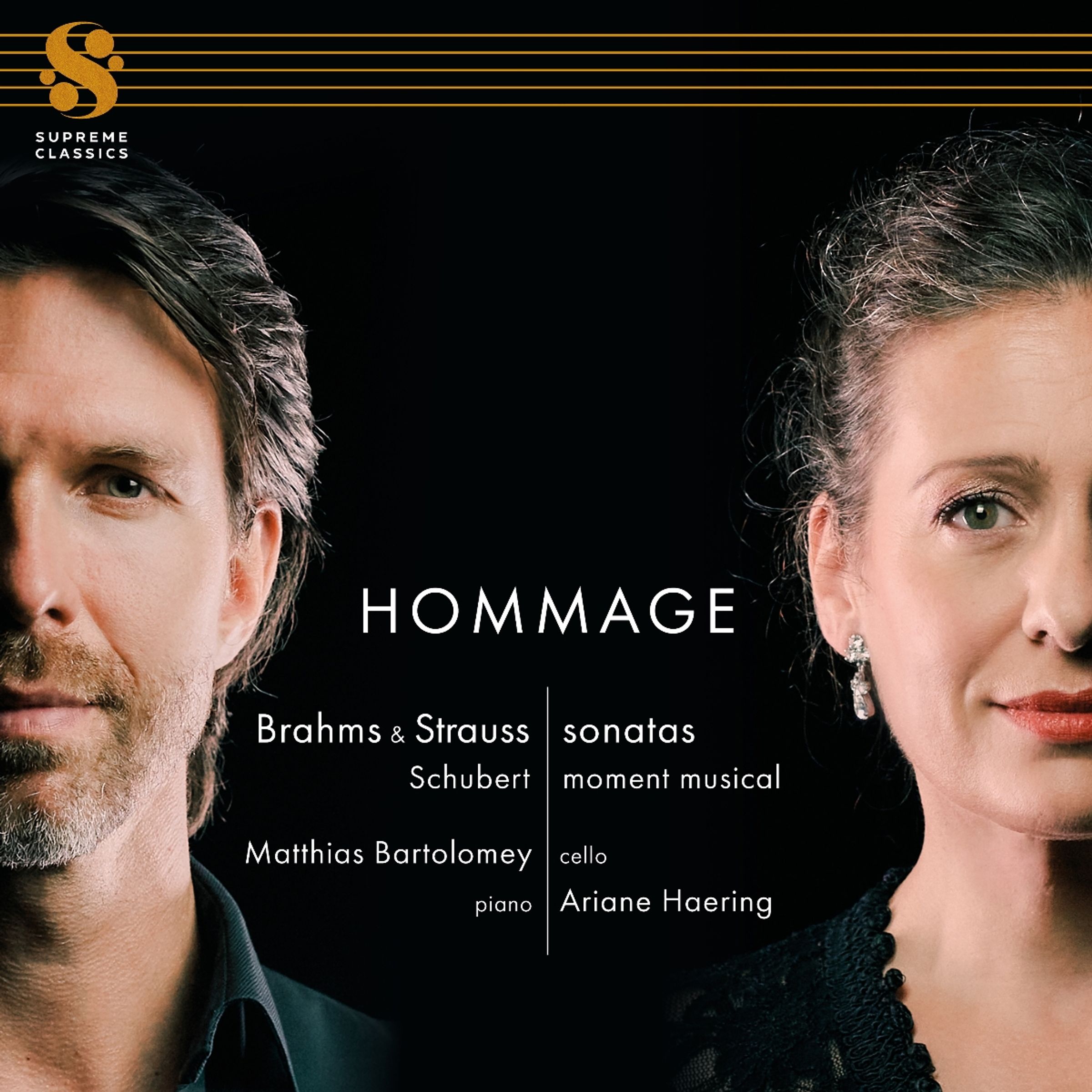 Im Februar 2001 nahm der erste Solocellist der Wiener Philharmoniker, Franz Bartolomey, die berühmte erste Sonate für Klavier und Violoncello von Johannes Brahms op. 38 in e-moll und ein Jugendwerk von Richard Strauss, die frühe F-Dur-Sonate, im Großen Sendesaal des ORF RadioKulturhaus auf. 25 Jahre später und zwei Jahre nach dem Ableben seines Vaters, präsentieren sein Sohn, der Cellist Matthias Bartolomey gemeinsam mit Pianistin Ariane Haering das Album "Hommage" mit dem gleichen Programm ergänzt durch ein Arrangement von Schuberts Moment musical Nr. 3. Für Matthias Bartolomey markiert die Aufnahme des Vaters und insbesondere dessen Interpretation einen äußerst prägenden Abschnitt seines musikalischen Werdegangs. Die Sonaten von Brahms und Strauss waren für Matthias seit fühester Jugend Teil der Klangkulisse seines Elternhauses. Ähnlich wie bei Richard Strauss' "Don Quixote" kannte er jeden Ton, jede Phrasierung und jedes Portamento seines Vaters in- und auswendig. "Hommage" wurde ebenso im Großen Sendesaal des RadioKulturhauses aufgenommen und stellt generationenübergreifende, essenzielle Fragen zwischen Vater und Sohn in den Raum: Wo hört der eine auf, wo beginnt der andere? Was trennt sie? Was vereint sie?
