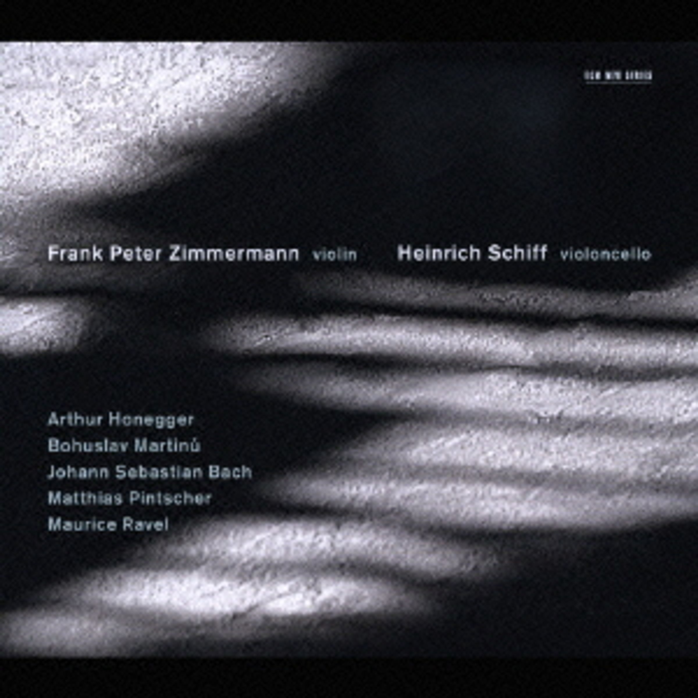 Oben: "Frank Peter Zimmermann violin, Heinrich Schiff violoncello". Namen von Honegger, Martinů, Bach, Pintscher, Ravel. Schatten und Lichtmuster im Hintergrund., CD