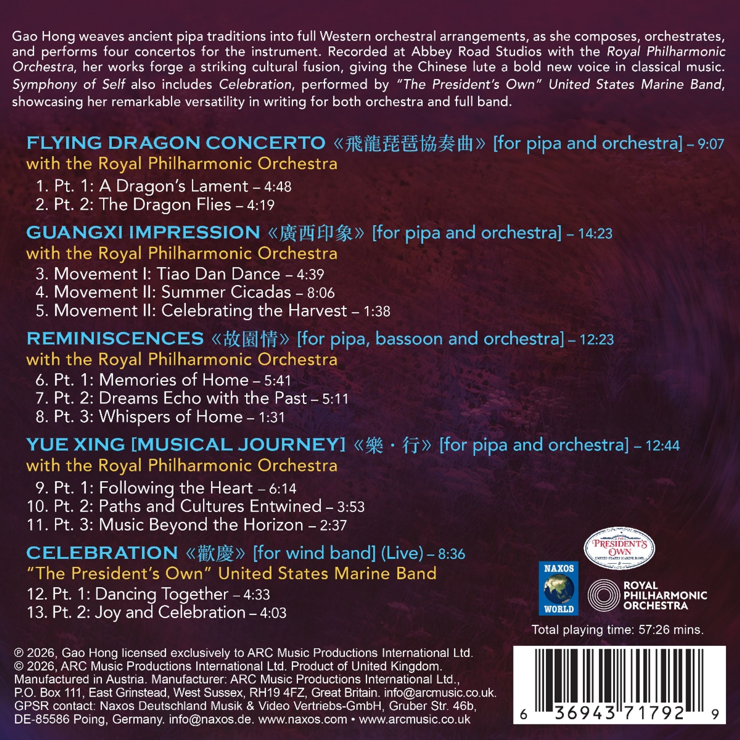 Die international gefeierte Pipa-Virtuosin und Komponistin Gao Hong verwebt alte Pipa-Traditionen mit westlichen Orchesterarrangements und schlägt damit ein aufregendes neues Kapitel in ihrer Karriere auf. Sie komponiert, arrangiert und interpretiert vier Konzerte für dieses Instrument. Aufgenommen in den legendären Abbey Road Studios mit dem Royal Philharmonic Orchestra, schaffen ihre Werke eine beeindruckende kulturelle Fusion und verleihen der chinesischen Laute eine kühne neue Stimme in der klassischen Musik. „Symphony of Self“ enthält außerdem das Stück „Celebration“, aufgeführt von der United States Marine Band („The President's Own“), das ihre bemerkenswerte Vielseitigkeit im Komponieren für Orchester und Blasorchester unter Beweis stellt.