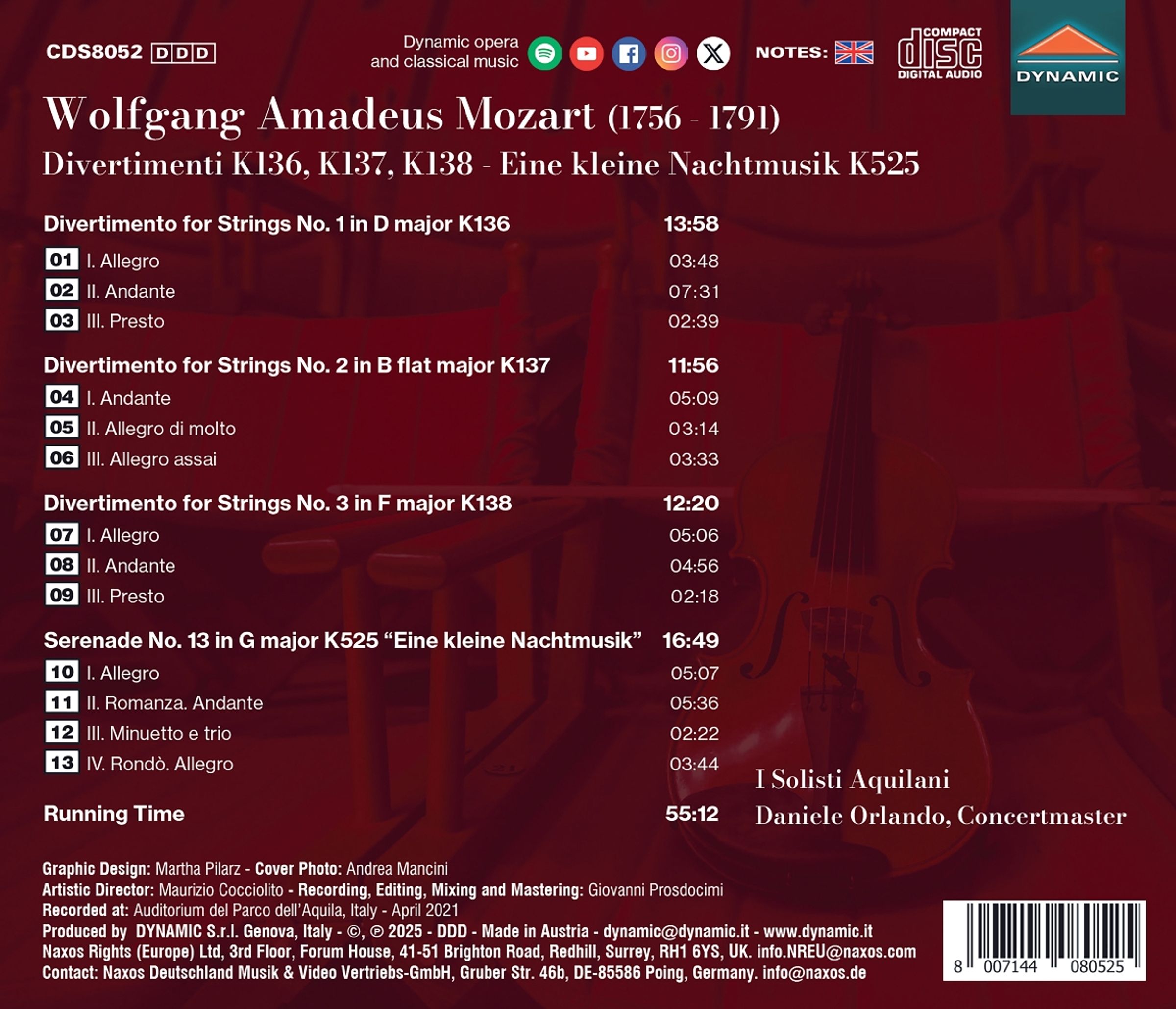 Die Popularität von Mozarts „Eine kleine Nachtmusik“ zeugt von der einzigartigen Eleganz und Raffinesse des Werks, das nach wie vor zu den beliebtesten Stücken der klassischen Musik zählt. Die transformativen Fähigkeiten, die zu diesem Meisterwerk führten, haben ihren Ursprung in Mozarts Reisen als Jugendlicher, auf denen er verschiedene Musiktraditionen aufnahm. Ebenfalls zu hören sind die drei reizvollen, originellen „Divertimenti“ KV 136–38, die Mozarts Erfahrungen in Italien feiern und einen Vorgeschmack auf die folgenden musikalischen Schätze geben. Die Werke werden vom italienischen Streichorchester I Solisti Aquilani aufgeführt. Der Klangkörper wurde 1968 gegründet und ist heute weltweit erfolgreich. I Solisti Aquilani haben bereits für viele italienische Komponisten Werke uraufgeführt, darunter Ennio Morricone, Marco Tutino und Marcello Panni. Sie haben zudem mit vielen namhaften Künstlern zusammengearbeitet: Maurice André, Felix Ayo, Paul Badura Skoda, Hermann Baumann, Michele Campanella, Severino Gazzelloni, Jean Pierre Rampal, Angela Hewitt und Krzysztof Penderecki, um nur einige zu nennen.