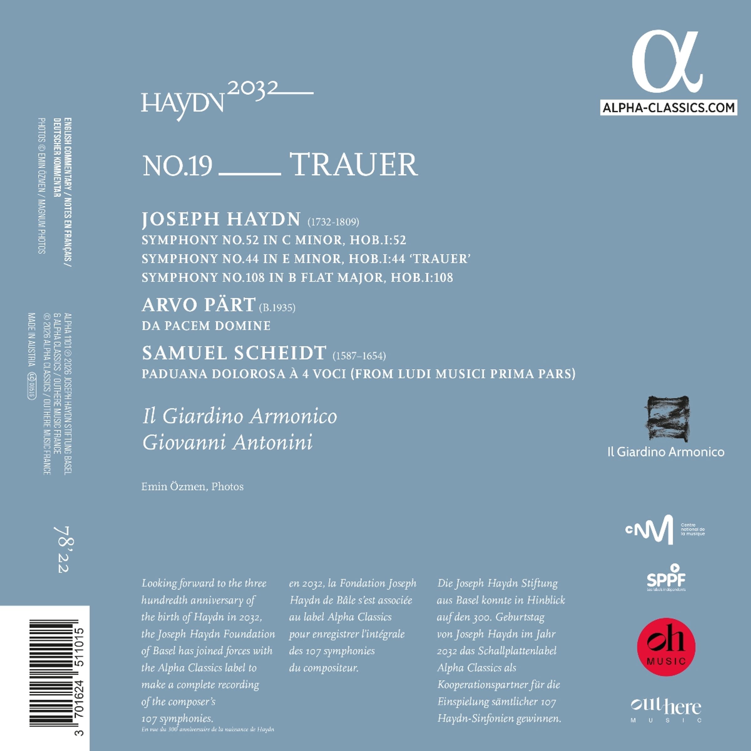 Dieser 19. Band der Haydn-Sinfonien-Gesamtausgabe erscheint pünktlich zum 40-jährigen Jubiläum von „Il Giardino Armonico“, dem Ensemble, das von Giovanni Antonini, dem künstlerischen Leiter der Reihe „Haydn 2032“, gegründet wurde und unter dessen Leitung steht. Il Giardino hat die Barockwelt mit seinem revolutionären Ansatz zu Vivaldi geprägt, doch Haydn ist seit langem Teil der Geschichte des italienischen Ensembles, und die in diesem Band enthaltene Sinfonie Nr. 44 war das erste Werk von Haydn, das das Ensemble unter Antonini aufführte. Der Titel dieser Symphonie, bekannt als „Trauersymphonie“, inspirierte die Aufnahme von Scheidts „Paduana Dolorosa“ in dieses Programm, die 1621 zu Beginn des blutigen Dreißigjährigen Krieges veröffentlicht wurde, sowie von Arvo Pärts „Da pacem Domine“, das dem Gedenken an die Opfer der Madrider Zuganschläge von 2004 gewidmet ist: „Ihre kontemplative Unbeweglichkeit und die traurige Pavana dolorosa übernehmen eine fast kathartische Funktion, die meiner Meinung nach eine perfekte Integration zwischen Musik zeigt, die stilistisch und chronologisch so weit voneinander entfernt ist“, sagt Antonini, der auch die Sinfonien Nr. 108 (1762) und Nr. 52 (1771) dirigiert.