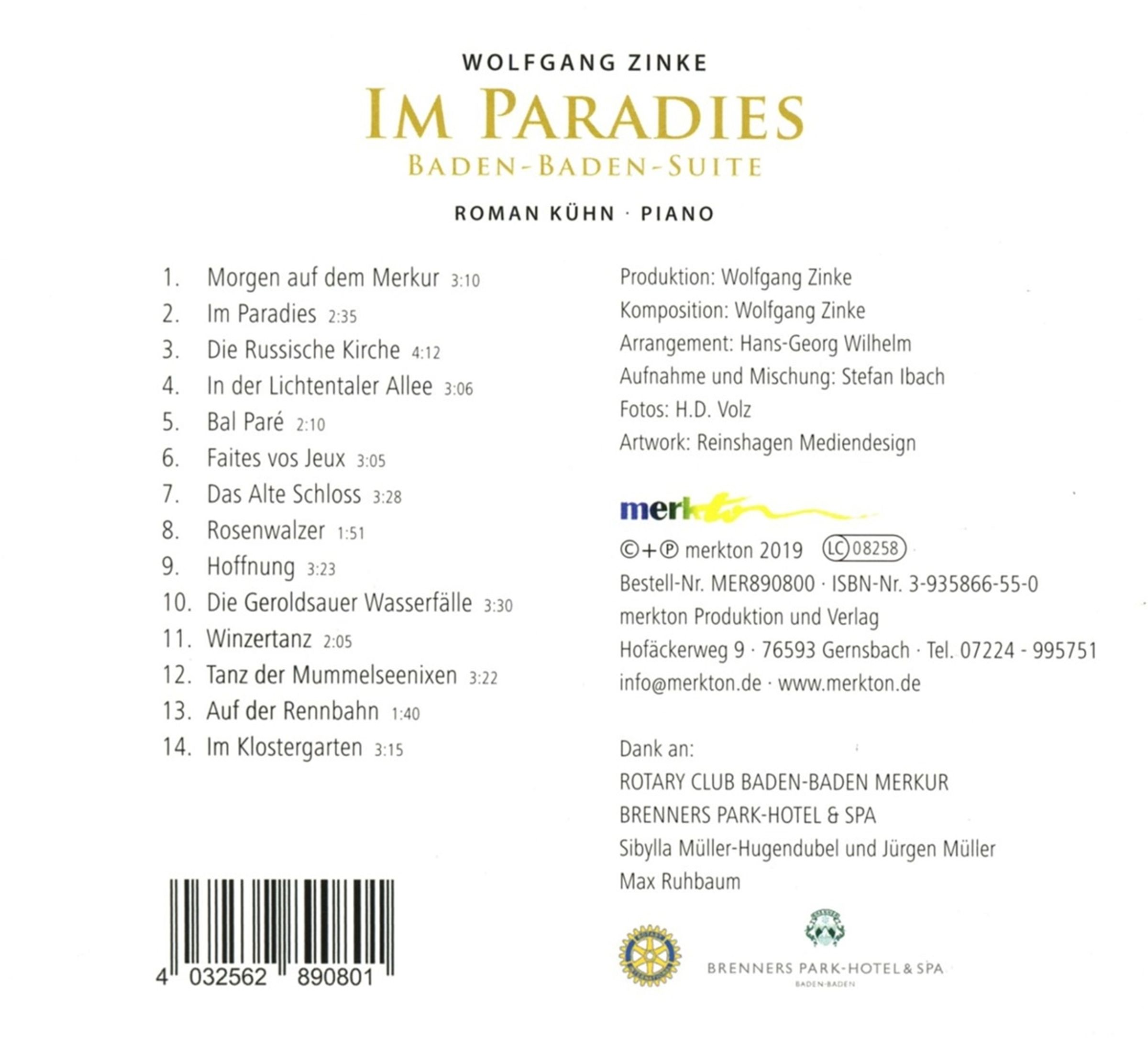 Morgen auf dem Merkur; Im Paradies; Die Russische Kirche; In der Lichtentaler Allee; Bal Pare; Faites vos Jeux; Das alte Schloss; Rosenwalzer; Hoffnung; Die Geroldsauer Wasserfälle; Winzertanz; Tanz der Mummelseenixen; Auf der Rennbahn; Im Klostergarten