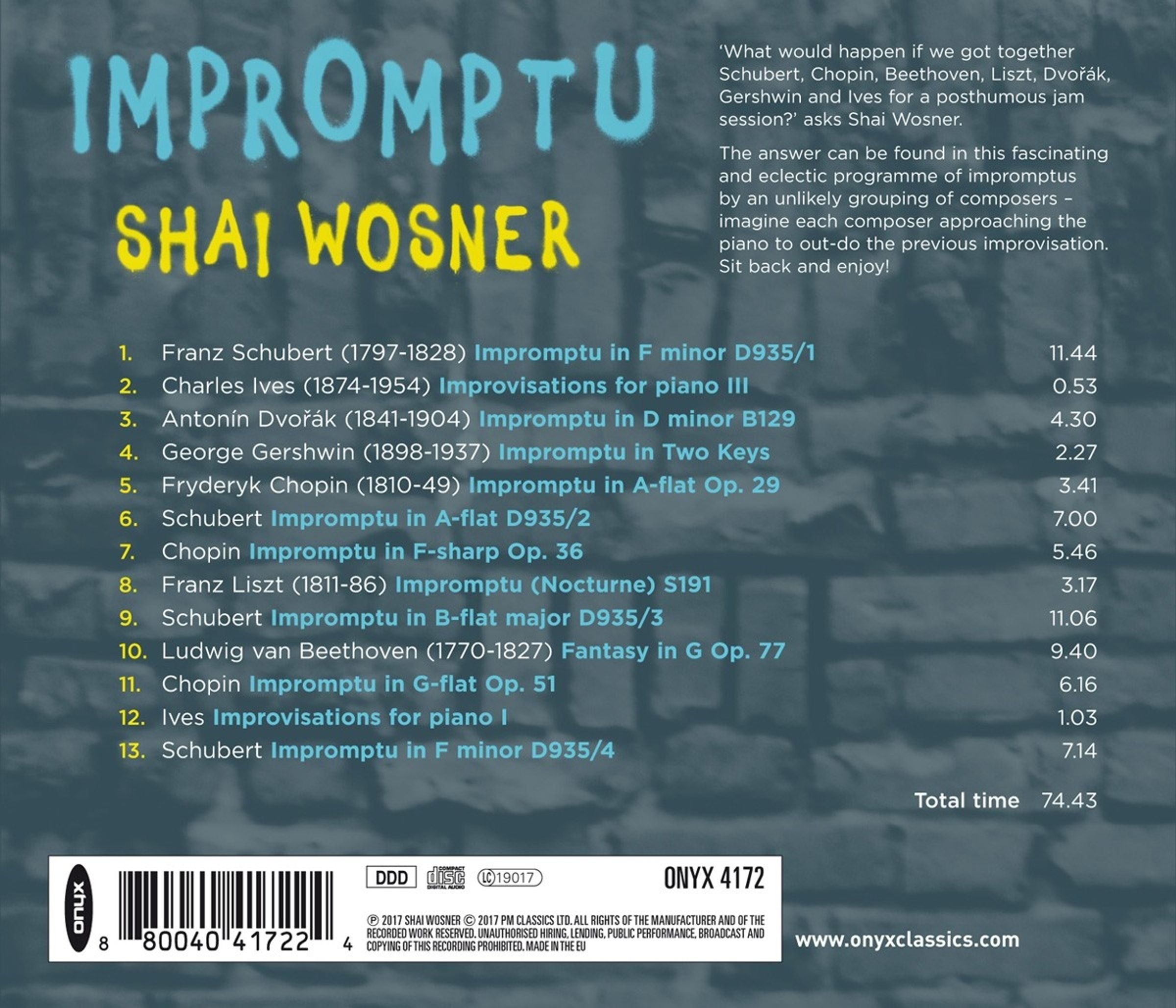 Schubert, Chopin, Dvorák, Beethoven, Liszt, Gershwin und Ives findet man selten zusammen auf einem CD- oder Konzertprogramm. Deswegen stellte Shai Wosner sie kurzerhand für seine neueste Produktion bei ONYX zusammen. Sein Ziel ist es, den Hörer herauszufordern, die eingespielten Impromptus-Kompositionen zu vergleichen, die klaren Unterschiede herauszufiltern oder aber Gemeinsamkeiten zu entdecken.