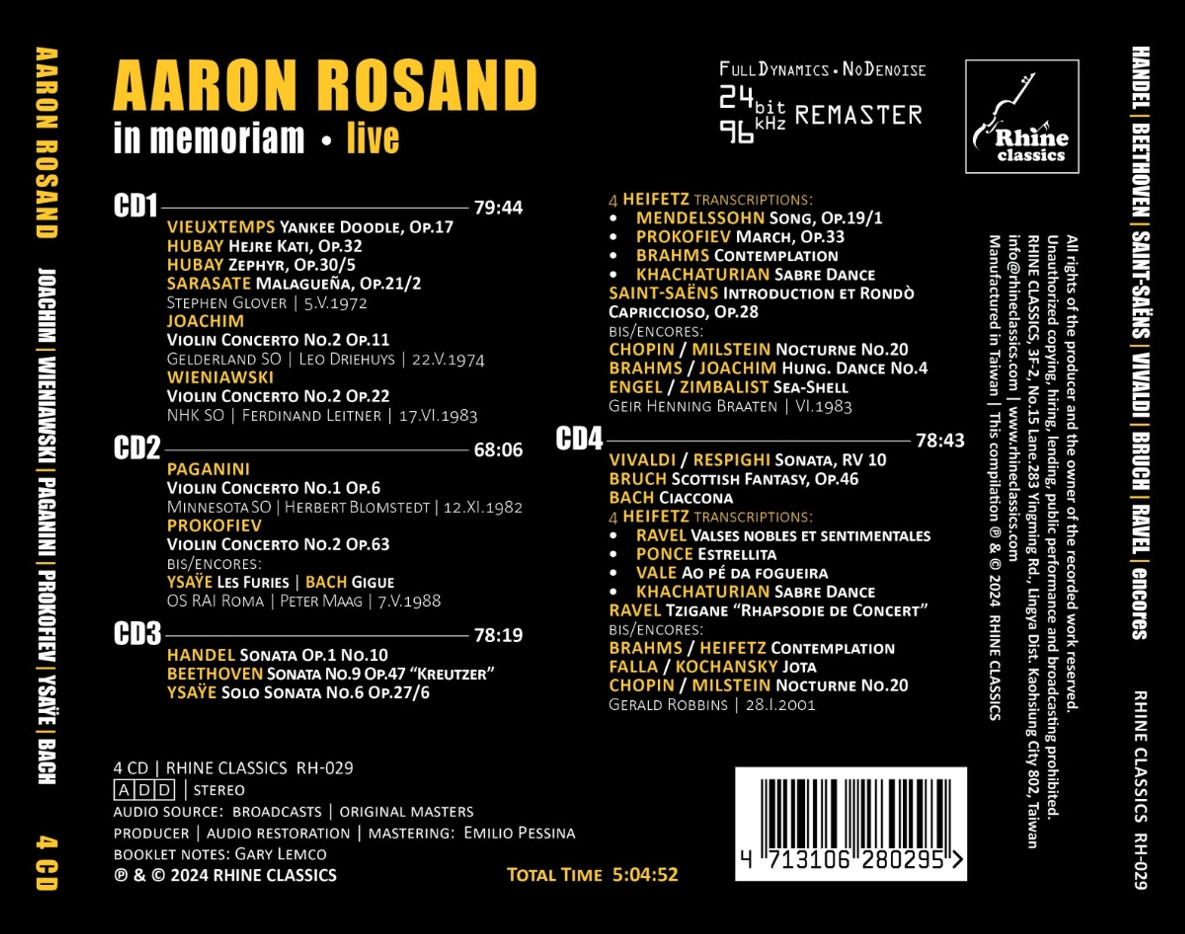 "AARON ROSAND in memoriam 4 CD." Schwarz-weiß, Mann spielt Violine, Logo oben rechts., 4 CDs