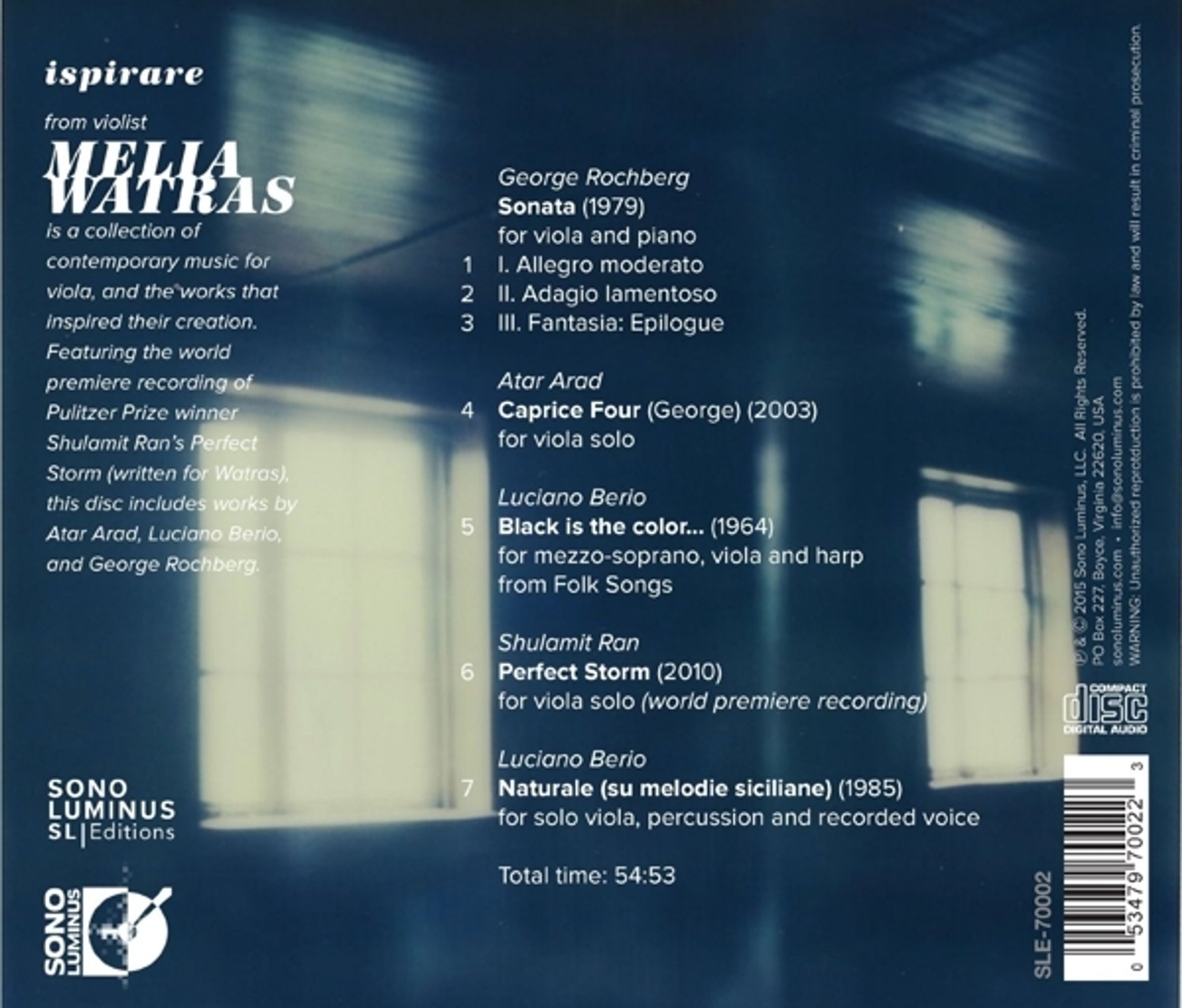 Ispirare besteht aus zeitgenössischer Musik für Viola und den Stücken, die ihre Entstehung inspiriert haben. Melia Watras wollte ein Programm rund um Werke aufbauen, die nicht nur spannend aufzuführen und anzuhören sind, sondern auch anderen Komponisten einen kreativen Funken geben. Atar Arad, Melias Violaprofessor, als sie an der Indiana University studierte, ist ein wunderbarer Komponist und außerdem ein brillanter Bratschist und Pädagoge. Er hat seine Reihe von Viola-Capricen als »Dankesbriefe an Komponisten beschrieben, die uns mit großartigen Bratschenstücken beehrt haben«. Der »George« im Titel seiner vierten Caprice ist George Rochberg. Zusätzlich zu dem Zitat aus der Rochberg-Sonate für Viola und Klavier fügt Atar auch eine musikalische Referenz zu George hinzu, indem er die Caprice, mit Ausnahme der Eröffnungsphrase, vollständig auf der G-Saite der Bratsche vertont. In einem weiteren Zusammenhang dieser Aufnahme ist Atars Tochter, die schöne Sängerin Galia Arad, in »Black is the color…« von Luciano Berio zu hören.