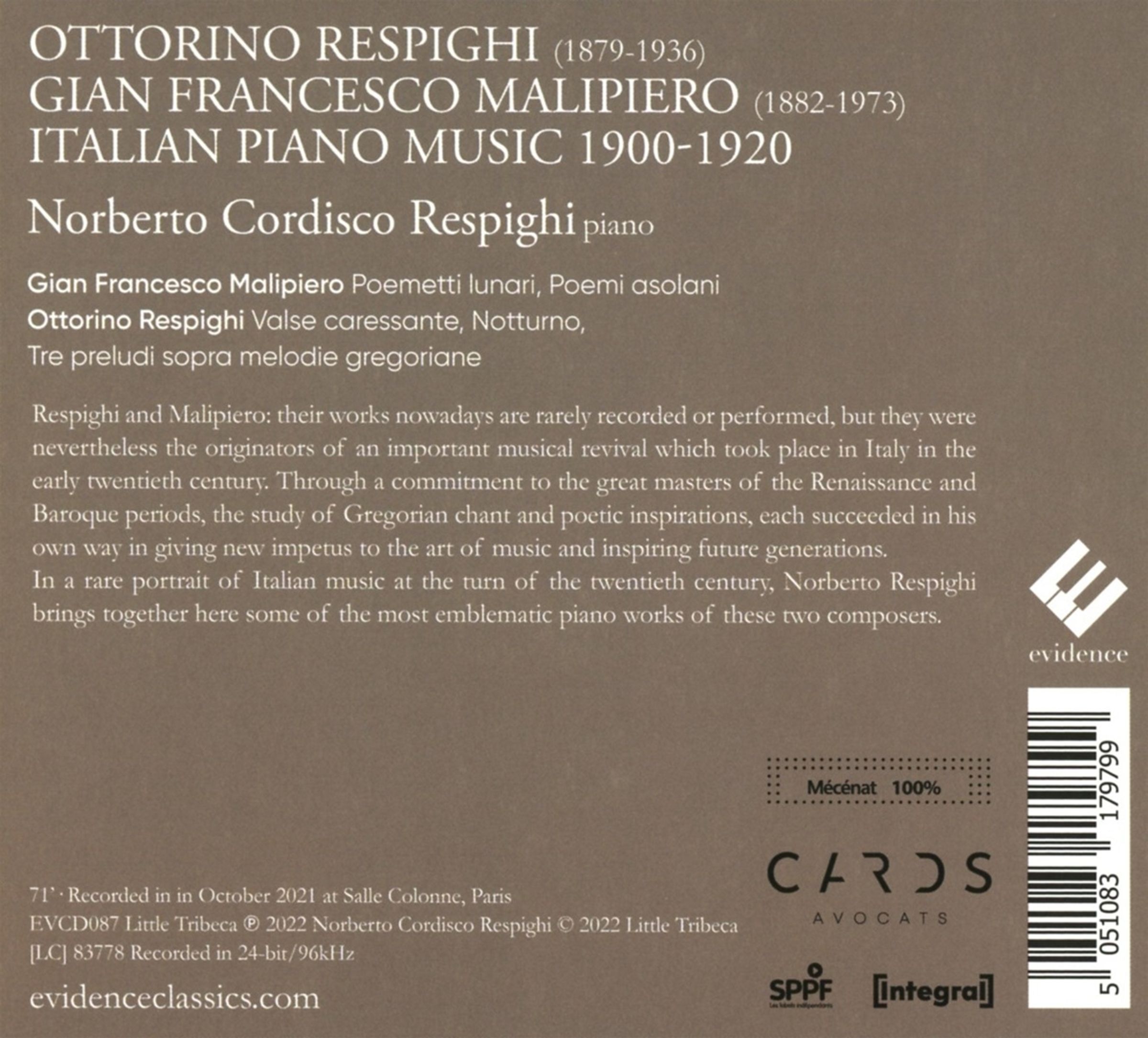 Die Werke von Respighi und Malipiero werden heute – bis auf wenige Ausnahmen – nur selten gespielt und aufgenommen. Dabei waren sie die Begründer einer bedeutenden musikalischen Wiederbelebung, die zu Beginn des 20. Jahrhunderts in Italien stattfand. Durch ihr Engagement für die großen Meister der Renaissance und des Barock und das Studium des Gregorianischen Chorals gelang es ihnen, der Musik neue Impulse zu geben und künftige Generationen zu inspirieren. Der Pianist und Musikwissenschaftler Norberto Respighi, Großneffe von Ottorino Respighi, präsentiert die bedeutendsten Klavierwerke dieser beiden wichtigen italienischen Komponisten.