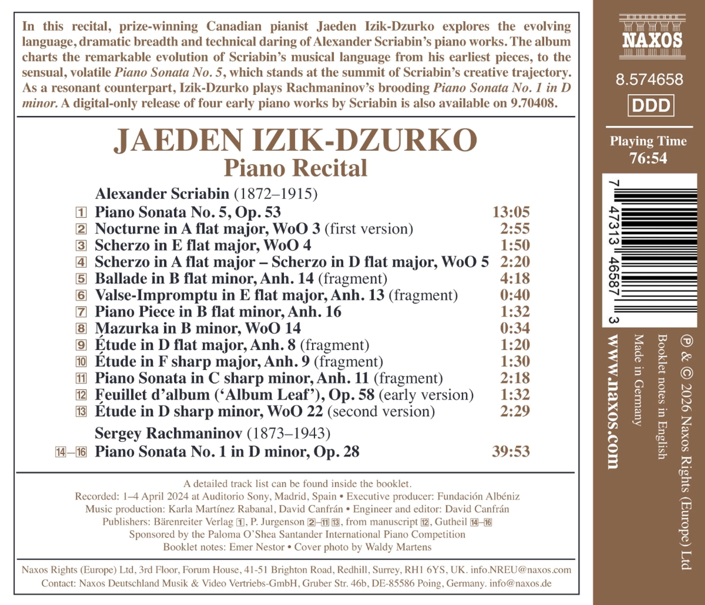 In diesem Rezital erkundet der preisgekrönte kanadische Pianist Jaeden Izik-Dzurko die sich entwickelnde Sprache, die dramatische Breite und den technischen Wagemut von Alexander Skrjabins Klavierwerken. Das Album zeichnet die bemerkenswerte Entwicklung von Skrjabins musikalischer Sprache von seinen frühesten Stücken bis hin zur sinnlichen, flüchtigen Klaviersonate Nr. 5 nach, die den Gipfel von Skrjabins kreativem Weg darstellt. Als klangvolles Gegenstück spielt Izik-Dzurko Rachmaninovs grüblerische Klaviersonate Nr. 1 in d-Moll. Eine rein digitale Veröffentlichung von vier frühen Klavierwerken Skrjabins ist ebenfalls erhältlich. Der kanadische Pianist Jaeden Izik-Dzurko war Goldmedaillengewinner des Internationalen Klavierwettbewerbs 2024 in Leeds und Empfänger eines Borletti-Buitoni Trust Fellowship. Er ist in vielen der weltweit führenden Konzertsäle aufgetreten, etwa der Weill Recital Hall in der Carnegie Hall und dem Gewandhaus in Leipzig. Zu seinen Orchesterpartnerschaften gehören das Orchestre symphonique de Montréal, das Bilbao Orkestra Sinfonikoa und das National Symphony Orchestra Ireland.