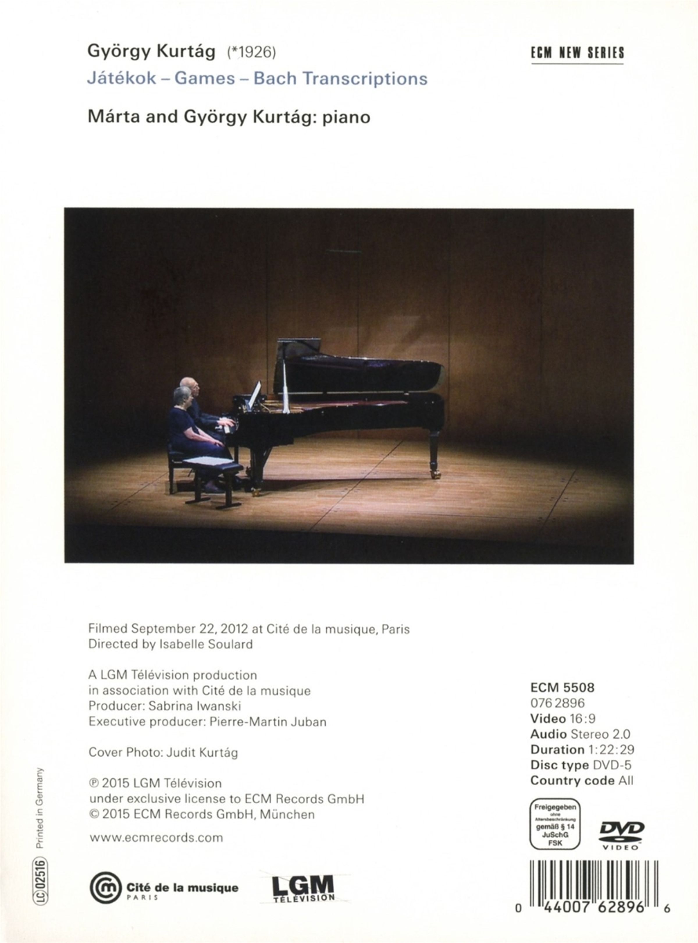 Untertitelt Játékok – Games and Transcriptions for piano solo and four hands, zeigt diese DVD/Blu-ray disc einen Film, den die Regisseurin Isabelle Soulard von einem Kurtág-Konzert in der Cité de la Musique in Paris drehte. Die Duo-Auftritte von Márta und György Kurtág zeichnen sich durch straffe Neue-Musik-Präzision aus, die durch aufmerksame Zuwendung grundiert wird (»Was für ein Spiel!« jubelte der »New Yorker« über ein Játékok-Konzert. »Die Töne wurden mit chirurgischer Sorgfalt gesetzt, innere Stimmen funkelten in kristallinen Mustern, schwer fassbare Seelenzustände wurden mit schnellen, leichten Strichen skizziert«).
