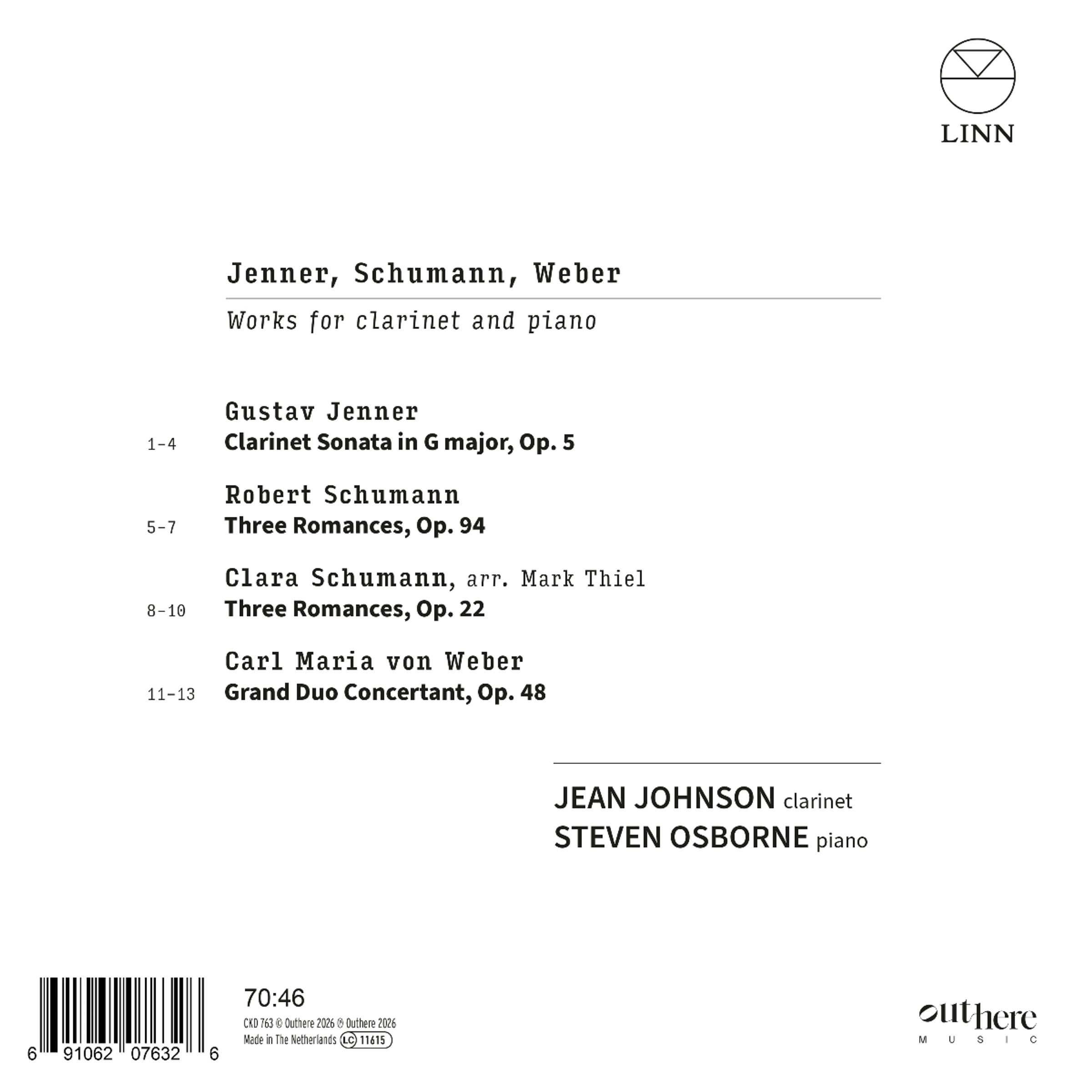 »Einfach phänomenal« (Fanfare) – die britisch-amerikanische Klarinettistin Jean Johnson gibt ihr Debüt bei Linn zusammen mit ihrem Ehemann, dem Pianisten Steven Osborne. Als begeisterte Kammermusikerin, die bereits in einigen der renommiertesten Konzertsälen der Welt aufgetreten ist, hat Jean ein Programm mit wunderschönen romantischen Werken zusammengestellt. Auch wenn Brahms in diesem Recital nicht vertreten ist, verbindet er doch alle vier Werke miteinander. Gustav Jenner war sein einziger Langzeit-Schüler; der stilistische Einfluss seines Lehrers ist in Jenners Klarinettensonate zu spüren, einem ambitionierten Werk, das die natürliche Melodiosität des Instruments zur Geltung bringt. Robert und Clara Schumann waren Freunde und Mentoren von Brahms, und Jean hat Arrangements ihrer Romanzen aufgenommen. Weber beschließt das Programm passend – Brahms verschob seinen Rückzug aus dem Musikleben, nachdem er sein Klarinettenkonzert gehört hatte – mit dem Grand Duo Concertant.
