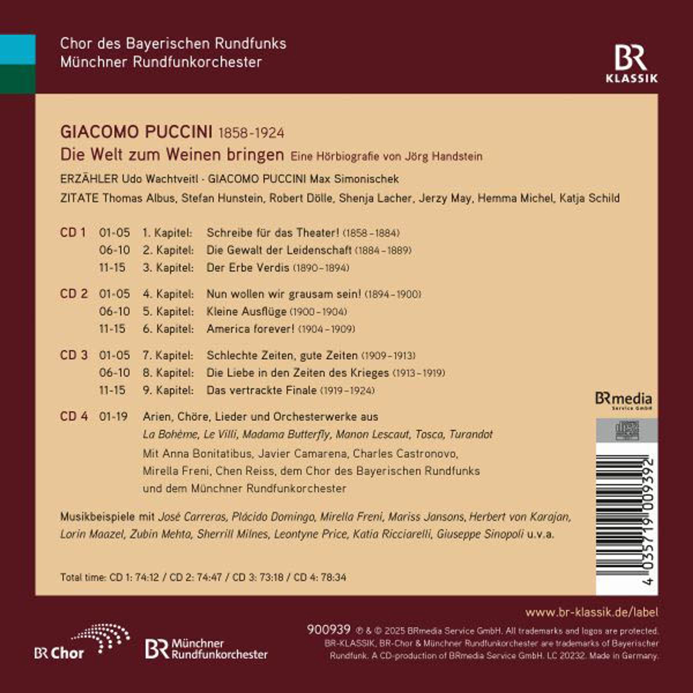Diese 15. Hörbiografie bei BR-KLASSIK (mit zahlreichen Musikbeispielen) beschäftigt sich in 9 Kapiteln mit dem aufregenden und ereignisreichen Leben Giacomo Puccinis vor dem Hintergrund des politischen Wandels in Italien und dem Übergang vom Belcanto zum Verismo. Der Erzähler ist Udo Wachtveitl, Burgschauspieler Max Simonischek übernimmt die Rolle von Giacomo Puccini.