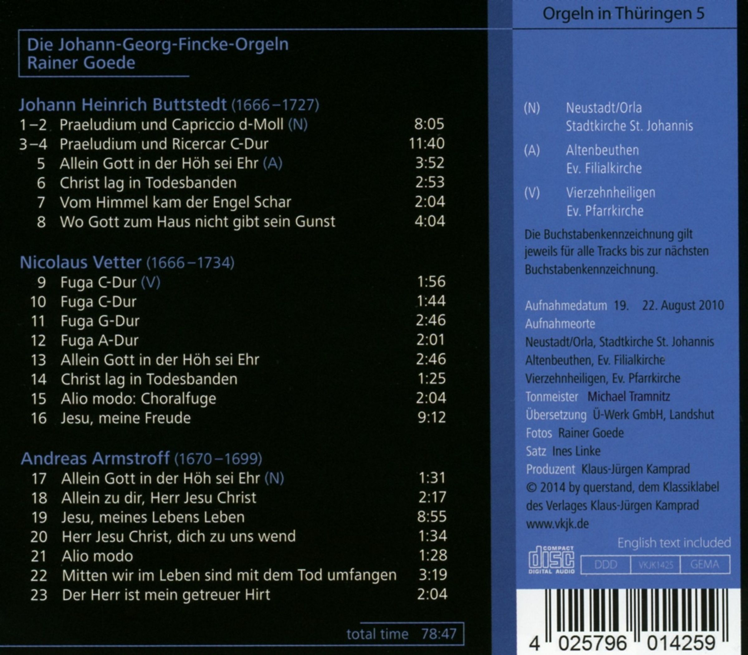 Johann Heinrich Buttstedt: Präludium & Capriccio d-moll; Präludium & Ricercar C-Dur; Allein Gott in der Höh sei Ehr; Christ lag in Todesbanden; Vom Himmel kam der Engel Schar; Wo Gott zum Haus nicht gibt sein Gunst