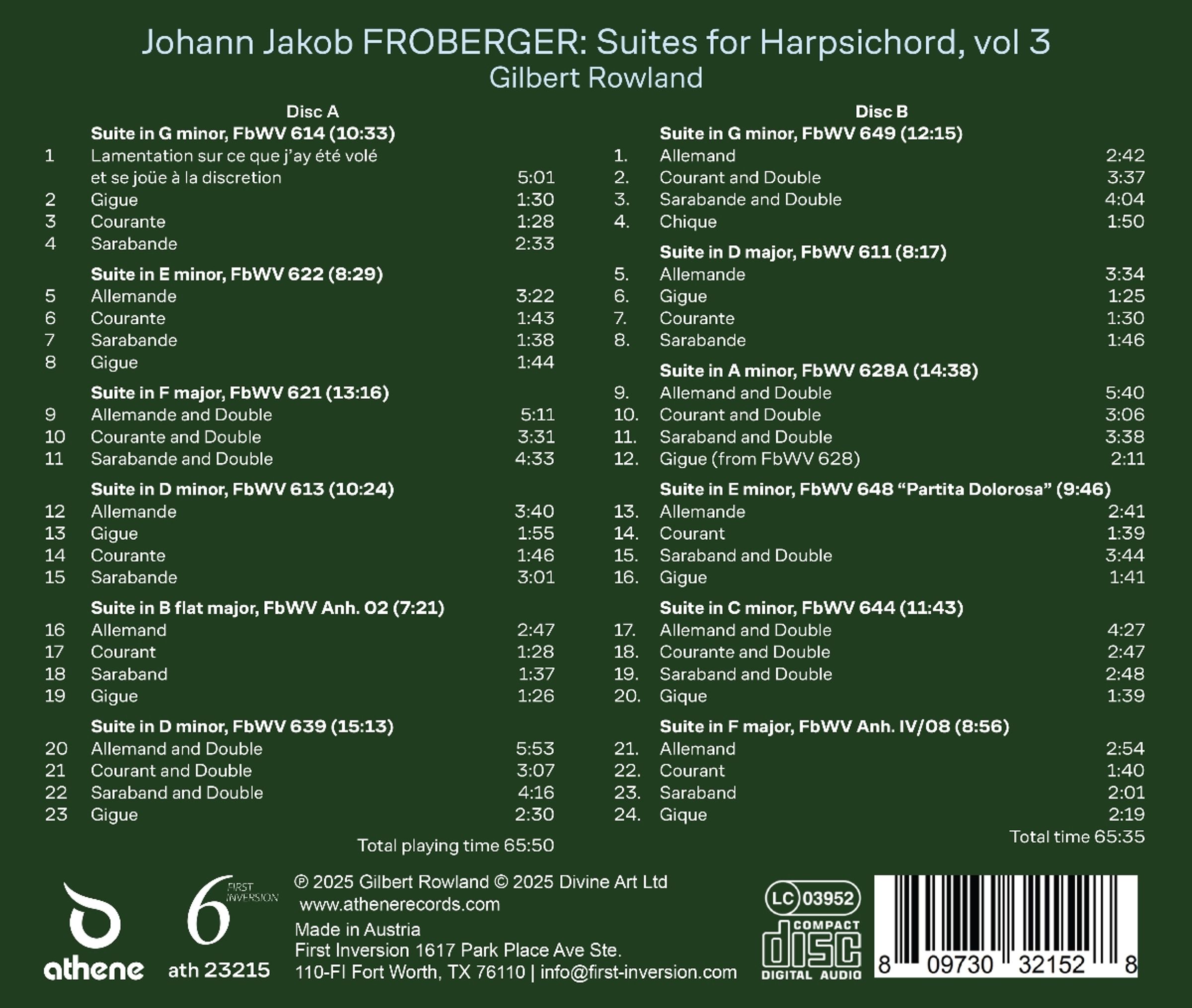 Der vierte und letzte Band der gefeierten Froberger-Reihe von Gilbert Rowland vervollständigt das bahnbrechende Aufnahmeprojekt des auf Alte Musik spezialisierten Labels Athene. Dieses Doppelalbum ist die jüngste Folge von Rowlands maßgeblicher Durchquerung der kompletten Cembalosuiten von Johann Jakob Froberger - einem Komponisten mit tiefgreifendem Einfluss, dessen Innovationen die Form der barocken Suite prägten, die später von Bach und Händel übernommen wurde. Die Serie wurde von der Kritik für ihren "herrlichen Klang", ihre "Energie und ihren guten Vorwärtsdrang" gelobt und hat breite Anerkennung gefunden. Aufgenommen in der wohltuenden Akustik der Holy Trinity Church, Weston, im Oktober 2024, ist das Album ein Wiedersehen mit dem Toningenieur John Taylor, dessen Produktion auf audiophilem Niveau bereits die vorherigen Bände untermauert hat.