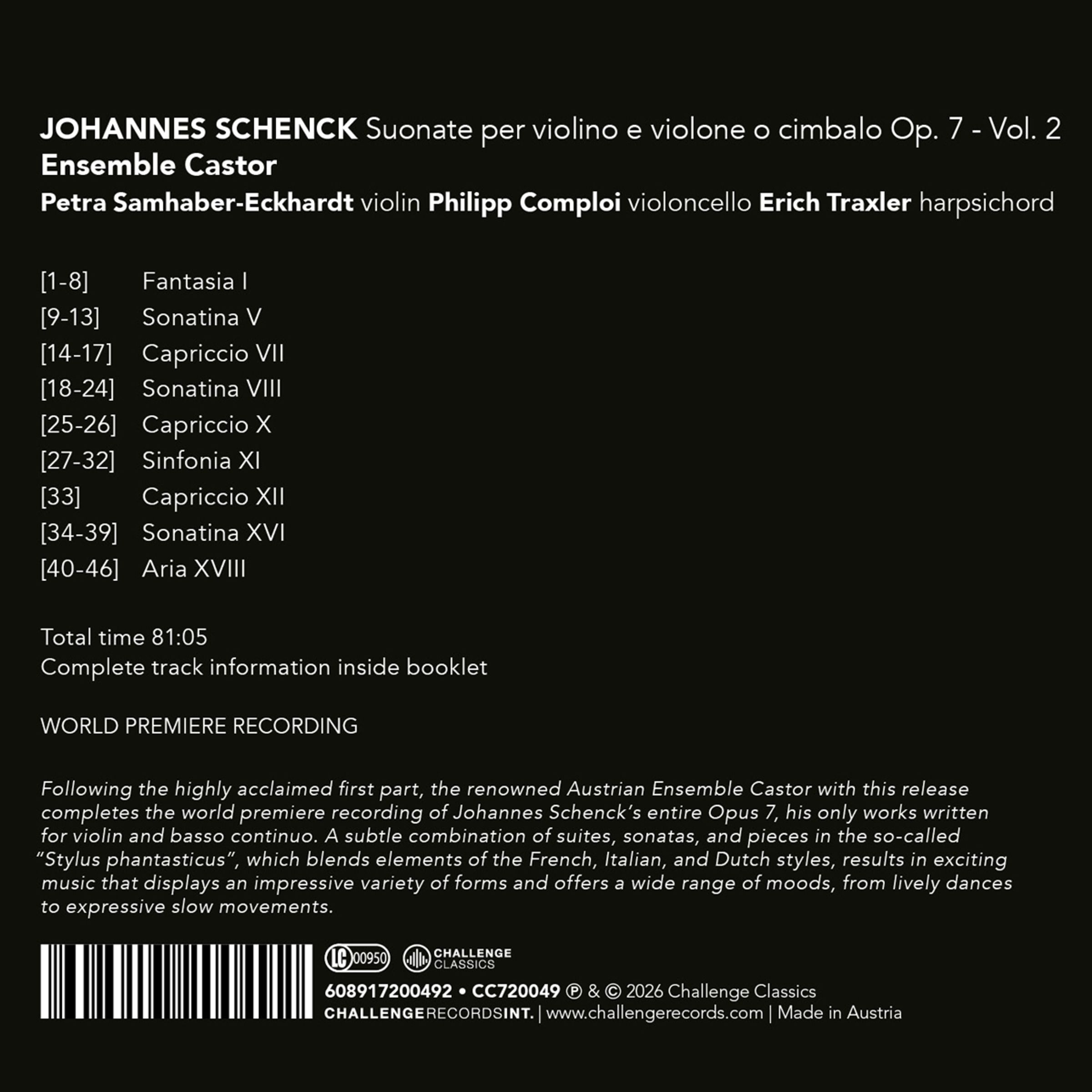 Ensemble Castor setzt seine gefeierte Reise in die Klangwelt von Johannes Schenck mit dem hier vollständig als Weltersteinspielung vorgelegten zweiten Band der Suonate per violino e violone o cimbalo, Op. 7, fort. Das 1699 veröffentlichte Opus 7 erweist sich als schillerndes Kompendium von Schencks kompositorischer Vorstellungskraft, in dem sich italienische Sonatenform, französische Tanzsuite und die expressive Freiheit des Stylus phantasticus zu einem reich nuancierten musikalischen Gewebe verbinden. Weit entfernt von der bescheidenen Behauptung, diese Werke seien „schnell für Anfänger“ geschrieben worden, offenbart die Sammlung tiefes künstlerisches Niveau, virtuoses Zusammenspiel und eine beinahe unerschöpfliche Freude am Experimentieren von erfinderischen Capriccios bis hin zur strahlenden Aria XVIII, die mit ihren sechs Variationen den Zyklus krönt. Mit ihrer tiefen Verpflichtung gegenüber der historischen Aufführungspraxis und ihrem feinsinnigen kammermusikalischen Dialog erwecken die österreichischen Musikerinnen und Musiker des Ensemble Castor dieses außergewöhnliche Repertoire auf eindrucksvolle Weise zum Leben. Nach dem internationalen Erfolg des ersten Bandes, der weltweit für seine Brillanz und stilistische Autorität gerühmt wurde, rückt diese neue Veröffentlichung Schencks Genie umso stärker ins Licht ein komponierender Virtuose, dessen Musik Grenzen und Moden übersteigt. In den Händen von Petra Samhaber-Eckhardt, Philipp Comploi und Erich Traxler entfaltet sich Opus 7 als lebendiges Gespräch über die Jahrhunderte hinweg: kühn, elegant und von unwiderstehlicher Ausdruckskraft.