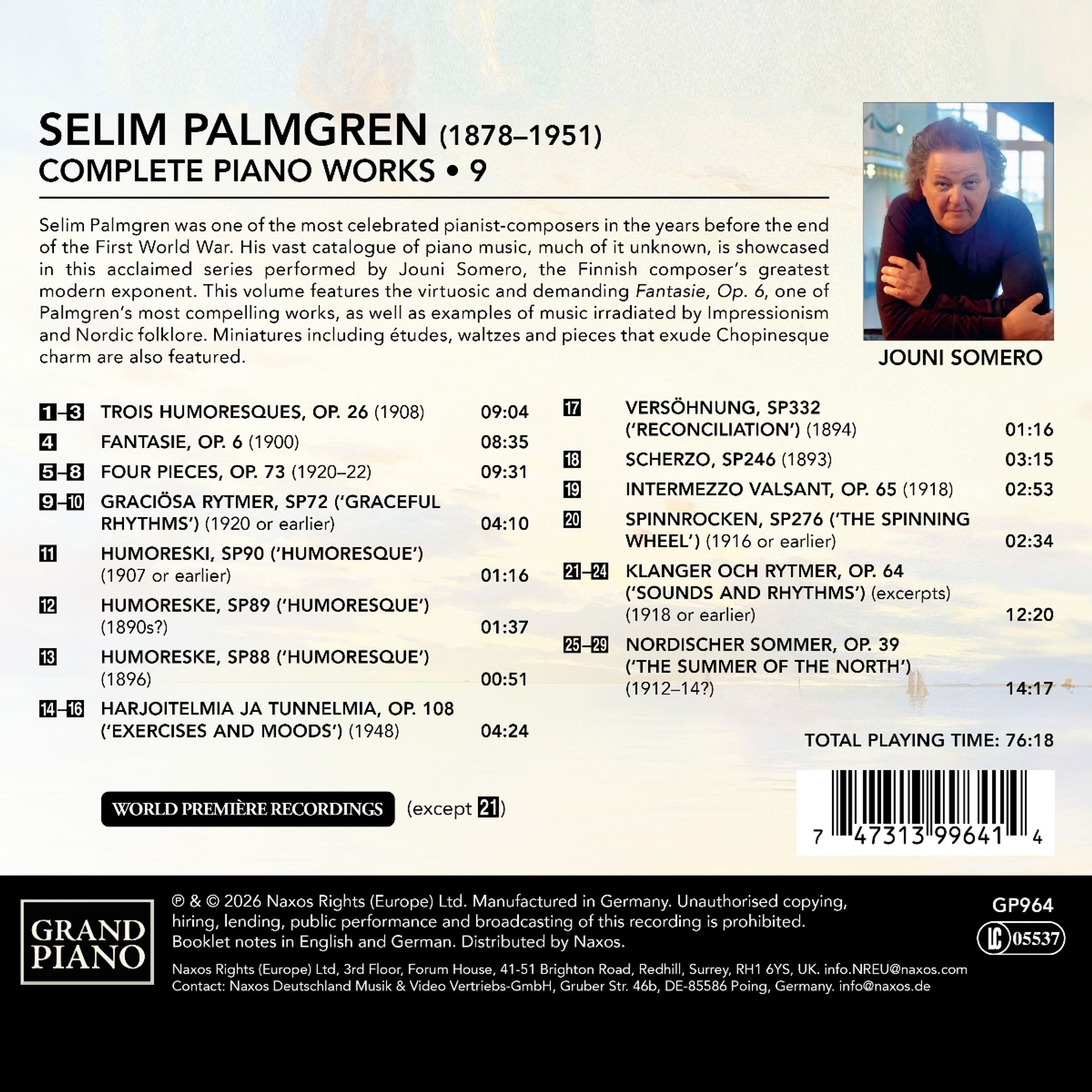 anspruchsvolle Fantasie op. 6, eines der fesselndsten Werke Palmgrens, sowie Beispiele von Musik, die vom Impressionismus und der nordischen Folklore beeinflusst ist. Auch Miniaturen wie Etüden, Walzer und Stücke mit chopineskem Charme stehen auf dem Programm. Bei den meisten Stücken handelt es sich um Weltersteinspielungen. Jouni Somero ist einer der aktivsten Interpreten unter den finnischen Musikern der Gegenwart. Er hat über 3.500 Konzerte
