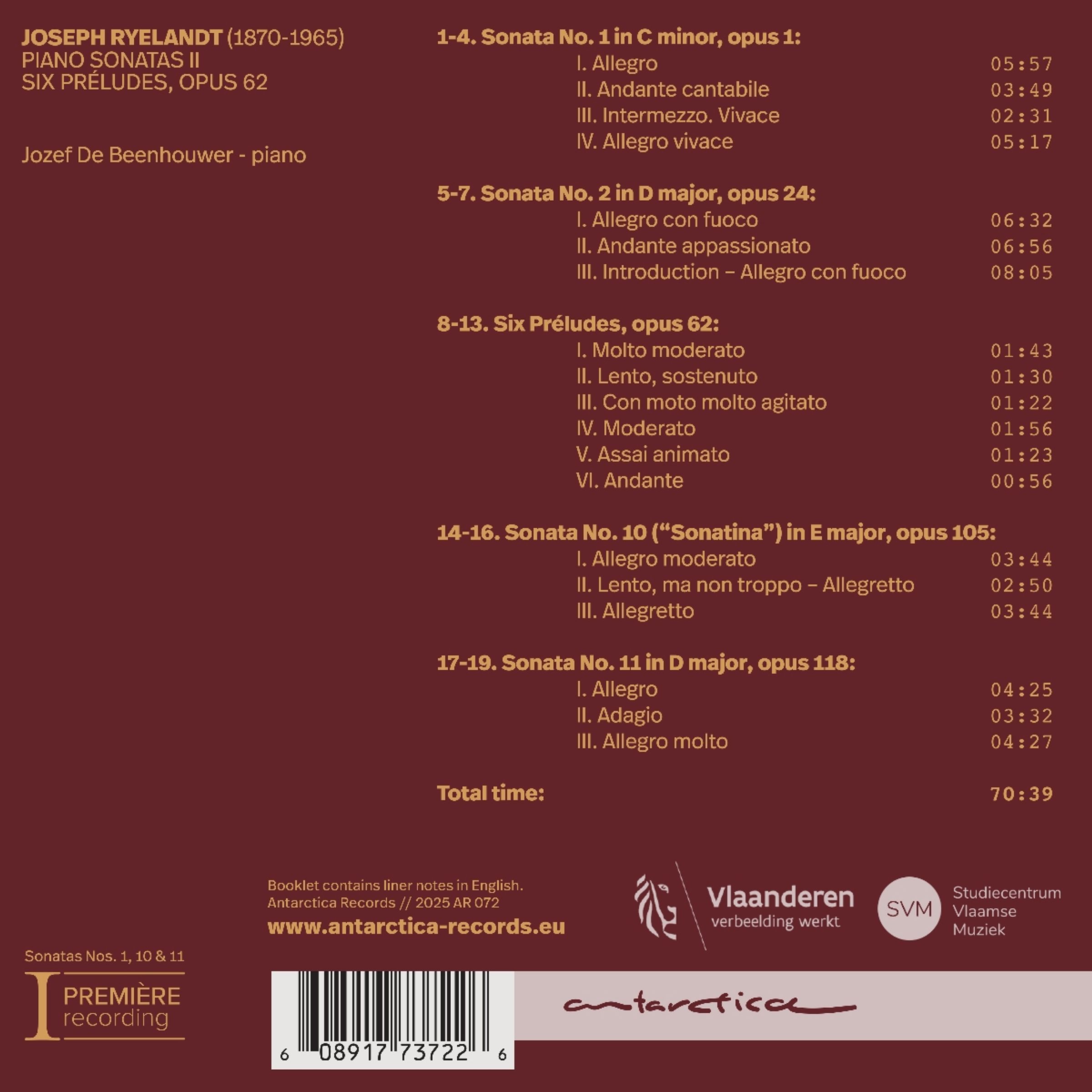 Die Reihe "Flämisches Musikerbe" ist eine Entdeckungsreise, die bemerkenswerte Stücke des musikalischen Erbes wiederbelebt. Vergessene Partituren werden wieder ans Licht gebracht, und bekannte Kompositionen erhalten eine neue Perspektive. In enger Zusammenarbeit mit dem Studienzentrum für flämische Musik basieren die Einspielungen auf intensiven Recherchen in Bibliotheken und Archiven und sorgfältig erstellten Partiturausgaben. Die von Kennern fachkundig ausgewählten Werke werden von geschätzten Musikern und Ensembles aufgeführt, die vernachlässigten und vergessenen Komponisten mit Leidenschaft zu der Anerkennung verhelfen, die sie verdienen. Mit diesen lebendigen Komponistenmonografien möchte Antarctica Records den Horizont erweitern und das Repertoire mit wiederentdeckten Schätzen aus der Vergangenheit bereichern. Dieser dritte Band der Reihe Flämisches Musikerbe konzentriert sich auf die Klavierwerke von Joseph Ryelandt (1870-1965). Die Aufnahme umspannt fast fünf Jahrzehnte seines Schaffens und enthält fünf Klavierwerke - darunter zwei frühe Sonaten, die ausdrucksstarken Sechs Préludes und zwei spätere Werke, die Ryelandts Entwicklung hin zu einem transparenteren, neoklassischen Stil verdeutlichen. Interpretiert von Jozef De Beenhouwer, der sich seit Jahrzehnten für Ryelandts Musik einsetzt, wirft das Album ein Licht auf eine vielseitige und raffinierte Stimme der belgischen Musikgeschichte.