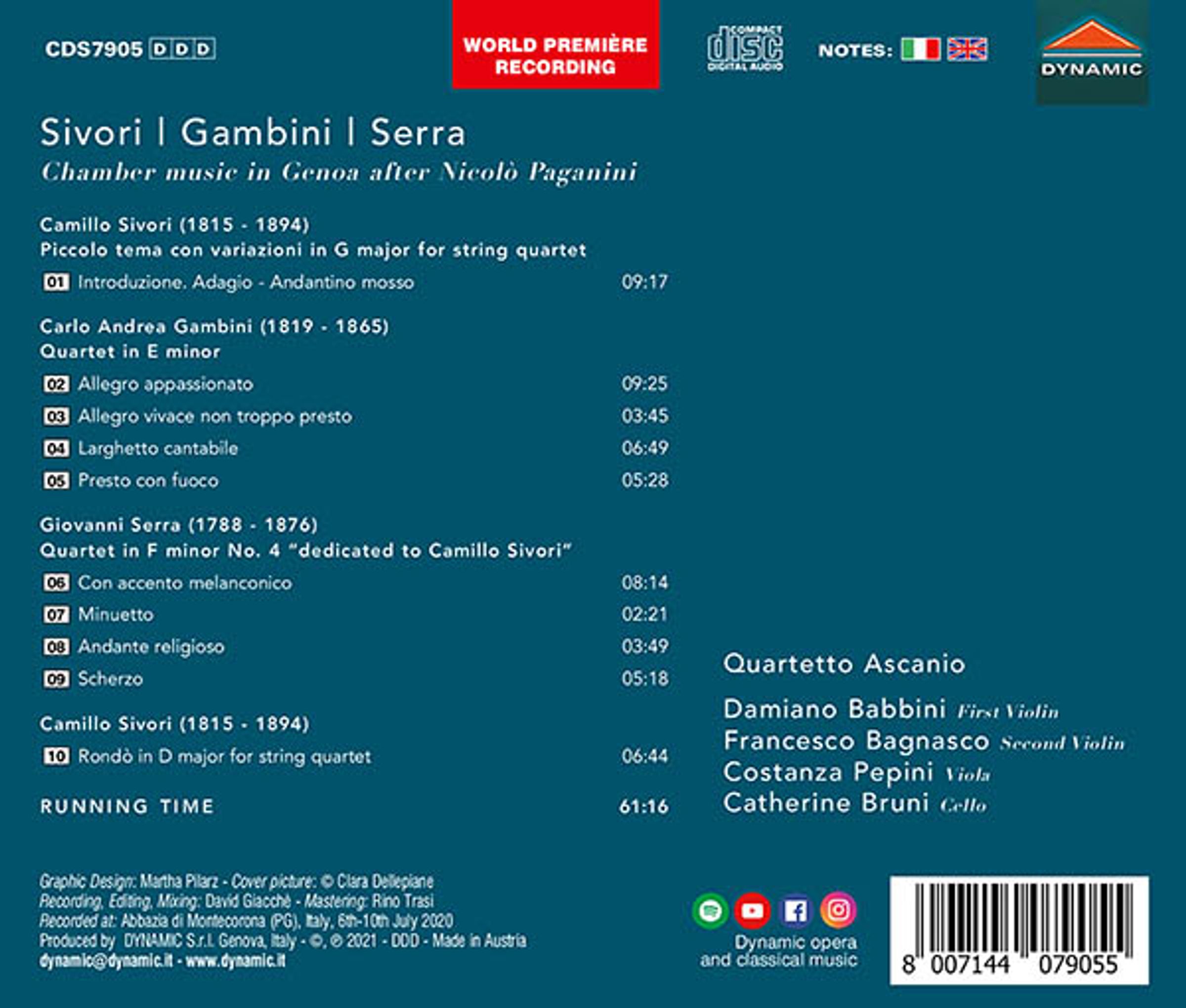 Die vorliegende Aufnahme des Quartetto Ascanio stellt weitgehend unbekannte Stücke für Streichquartett vor, die in Genua in der Zeit nach Nicolo Paganini entstanden sind. Die Werke von Camillo Sivori, Carlo Andrea Gambini und Giovanni Serra spiegeln die Virtuosität und Italianitá dieser Zeit wunderbar wider.