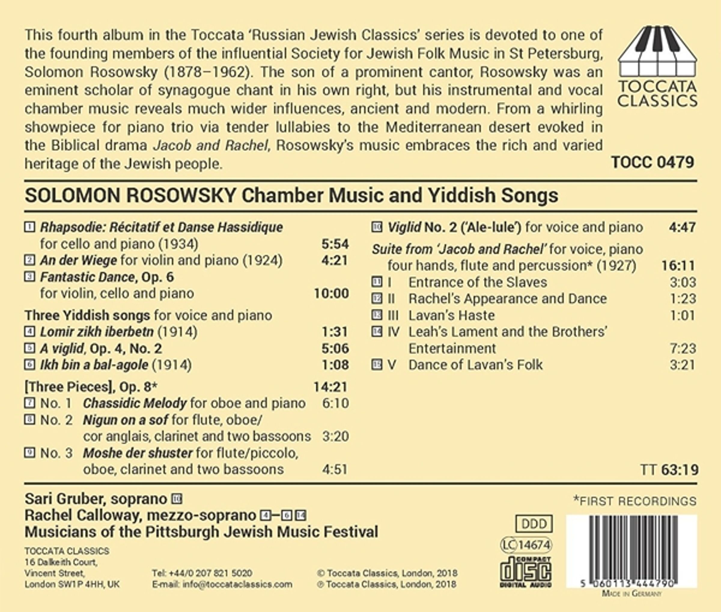 Kammermusik: Recitatif & Danse Hassidique aus der Rhapsodie für Cello & Klavier; An der Wiege für Violine & Klavier; Fantastic Dance op. 6 für Klaviertrio; Chassidic Melody für Oboe & Klavier; Nigun on a sof für Flöte, Oboe, English Horn, Klarinette & 2 Fagotte; Moshe der shuster für Flöte, Oboe, Klarinette & 2 Fagotte