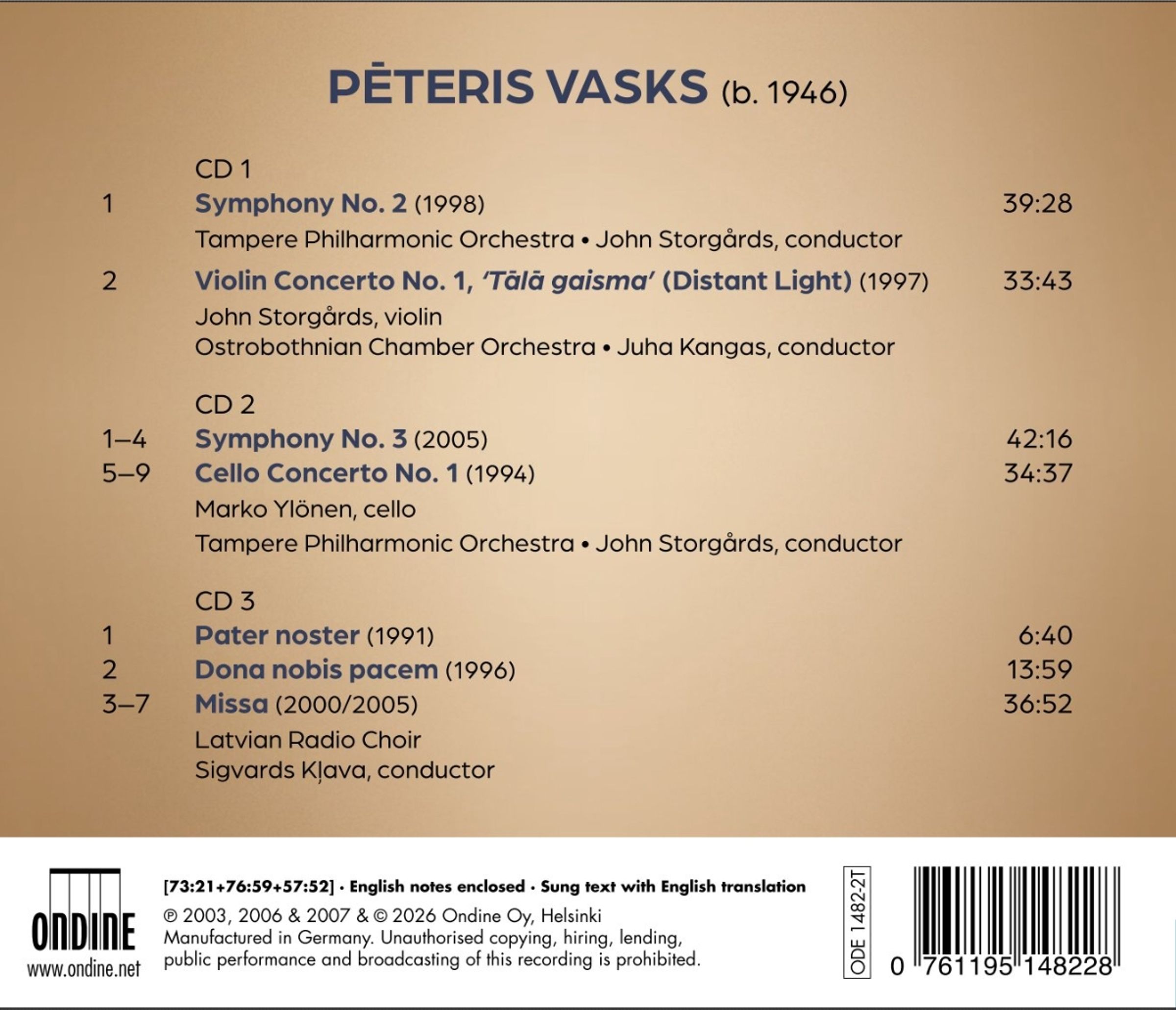 - Latvian Radio Choir, Sinfonietta Riga, Tampere Philharmonic Orchestra, Ostrobothnian Chamber Orchestra, Sigvards Klava, John Storgards, Juha Kangas