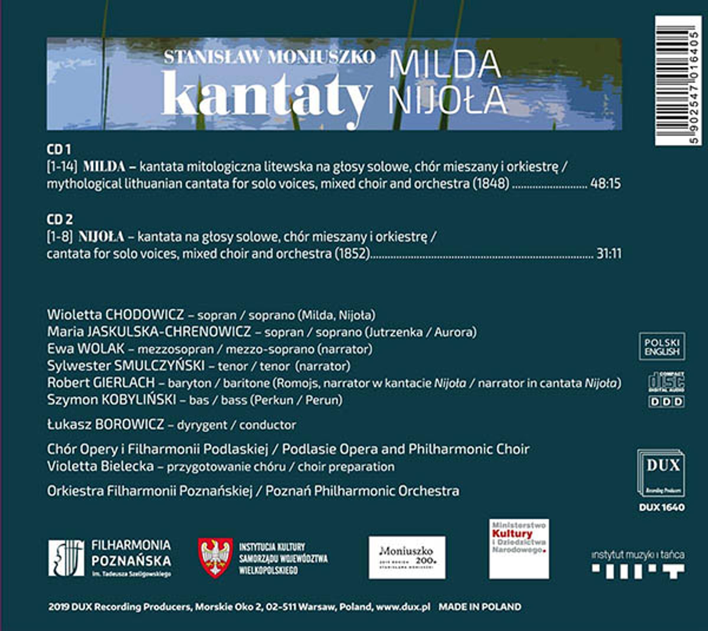 Neben den Opern gehörten die weltlichen Kantaten Milda und Nijoła zu den erfolgreichsten Kompositionen Stanisław Moniuszkos zu seinen Lebzeiten. Angesichts ihres melodischen Einfallsreichtums ist es verwunderlich, dass die beiden Werke hier erstmals auf CD eingespielt wurden. Die Aufnahme bei DUX schließt somit eine eklatante Lücke in der Diskografie des bedeutenden polnischen Nationalkomponisten.
