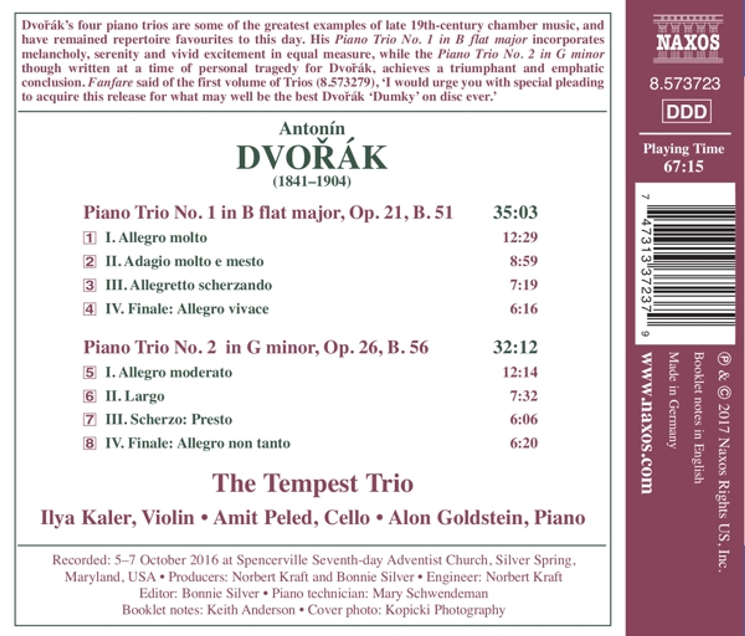 Das mit Ilya Kaler, Amit Peled und Alon Goldstein so herausragend und prominent besetzte Tempest Trio wurde von mehreren US-Medien schon mit dem »Million Dollar Trio« (Rubinstein, Piatigorsky und Heifetz) verglichen. Und dieser hoch gegriffene Vergleich ist zumindest qualitativ jederzeit berechtigt: Ihre 2013 begonnene Gesamteinspielung der populären Dvořák-Klaviertrios zählt zweifellos zu den besten der besten in der Diskografie dieses viel einspielten Repertoires. Nun folgt mit dem zweiten und letzten Album in der Reihe der krönende Abschluss dieser bedeutenden Gesamtaufnahme. Ein Pflicht-Album!