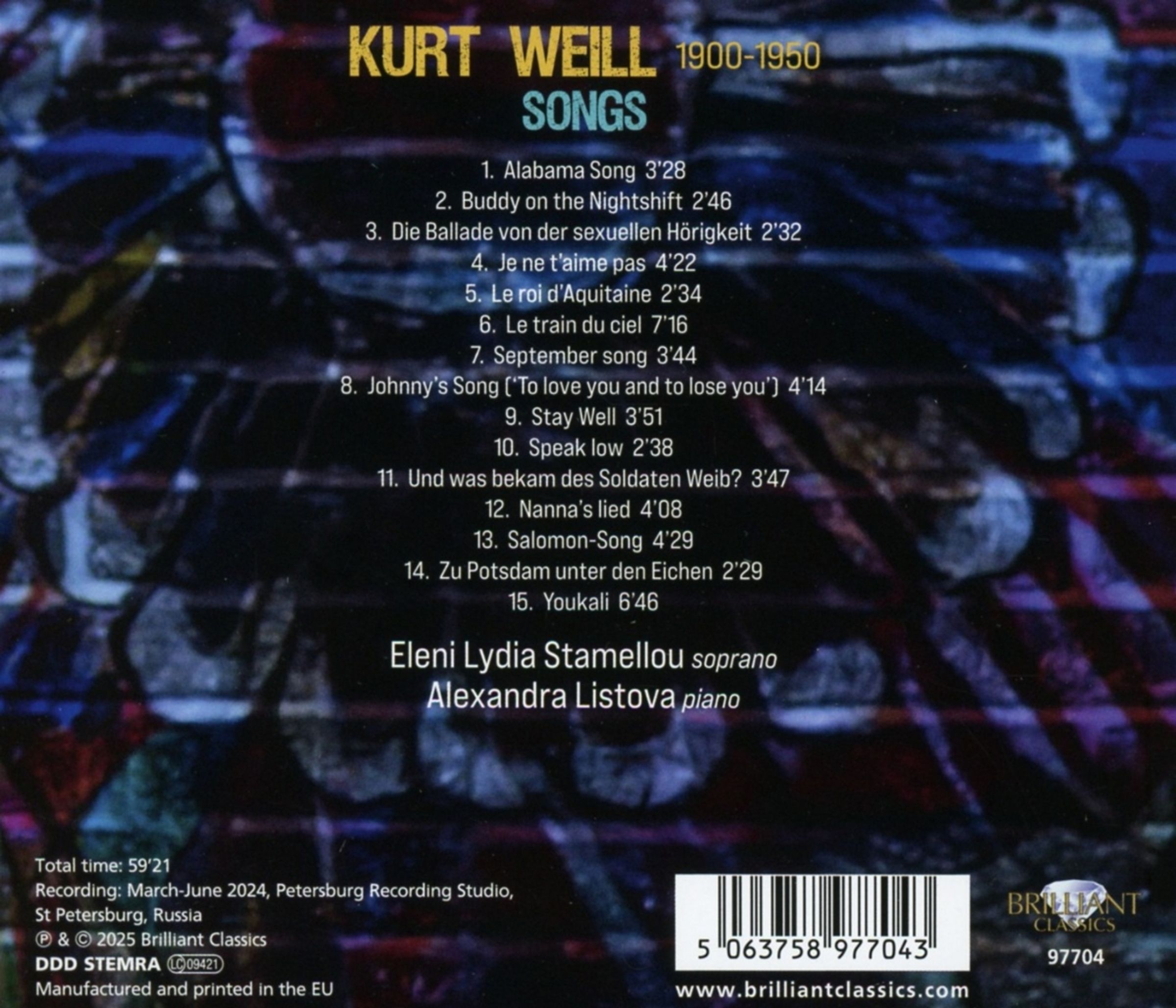 Weills Lieder für Gesang und Klavier bilden ein reichhaltiges und facettenreiches Werk – zugleich anspruchsvoll und zugänglich, europäisch und amerikanisch, klassisch und populär –, das die unermüdliche Kreativität einer der originellsten musikalischen Stimmen des 20. Jahrhunderts verkörpert. Die griechische Sopranistin Eleni Lydia Stamellou war Preisträgerin des Ferruccio-Tagliavini-Wettbewerbs in Österreich, dessen Juryvorsitzende Dame Joan Sutherland war. Anschließend besuchte sie Meisterkurse bei Teresa Berganza, Edda Moser und Christa Ludwig. Sie sang in Opernproduktionen mit MusicAeterna unter der Leitung von Teodor Currentzis. Ihre Spezialgebiete sind Renaissance-/Barock- und zeitgenössische Musik. Sie sang in Produktionen von Berio und Hersant. Ihre hervorragende Klavierpartnerin ist Alexandra Listova.