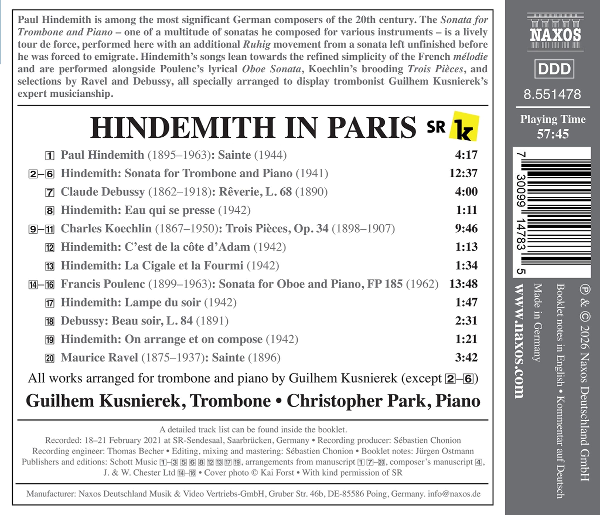 Paul Hindemith zahlt zu den bedeutendsten deutschen Komponisten des 20. Jahrhunderts. Die Sonate für Posaune und Klavier - eine von zahlreichen Sonaten, die er für verschiedene Instrumente komponierte - ist ein lebhaftes Meisterwerk, das hier zusammen mit einem zusätzlichen 'Ruhig'-Satz aus einer Sonate aufgeführt wird, die er vor seiner erzwungenen Emigration unvollendet hinterließ. Hindemiths Lieder tendieren zur raffinierten Schlichtheit der französischen Melodie und werden neben Poulencs lyrischer Oboensonate, Koechlins nachdenklichen "Trois Pieces" sowie Auszügen von Maurice Ravel und Claude Debussy aufgeführt, die alle eigens arrangiert wurden, um die meisterhafte Musikalität des Posaunisten Guilhem Kusnierek zur Geltung zu bringen - gewöhnlich werden sie nicht mit diesem Instrument in Verbindung gebracht. Selten zu hörende Werke wie Koechlins sparsame, aber dennoch wunderbar ausdrucksstarke "Trois Pieces" sind hier vertreten sowie Lieder, die eine lyrische Seite von Hindemiths Schaffen zeigen, die nur wenige Menschen kennen dürften. Der Posaunist Guilhem Kusnierek ist Preisträger zahlreicher internationaler Wettbewerbe, darunter Lieksa (Finnland), Porcia (Italien) und Jeju (Südkorea). Er tritt sowohl national als auch international auf und gastiert als Solist bei bedeutenden Orchestern wie dem Symphonieorchester des Bayerischen Rundfunks. Guilhem Kusnierek studierte bei Abel Thomas, Michel Becquet, Jorgen van Rijen und Daniel Lassalle (auf historischer Posaune). Christopher Park ist ein Pianist, der 'mit seiner faszinierenden technischen Meisterschaft, seiner erstaunlichen musikalischen Reife und einem besonders intensiven Spielstil besticht' - so die Begründung für den Leonard-Bernstein-Preis. Zu den Orchestern, mit denen Park aufgetreten ist, gehören die Wiener Symphoniker und das Spanische Nationalorchester, um nur zwei von vielen zu nennen. Zu seinen bisherigen Kooperationspartnern zählen Dirigenten wie Christoph Eschenbach und Paavo Järvi.