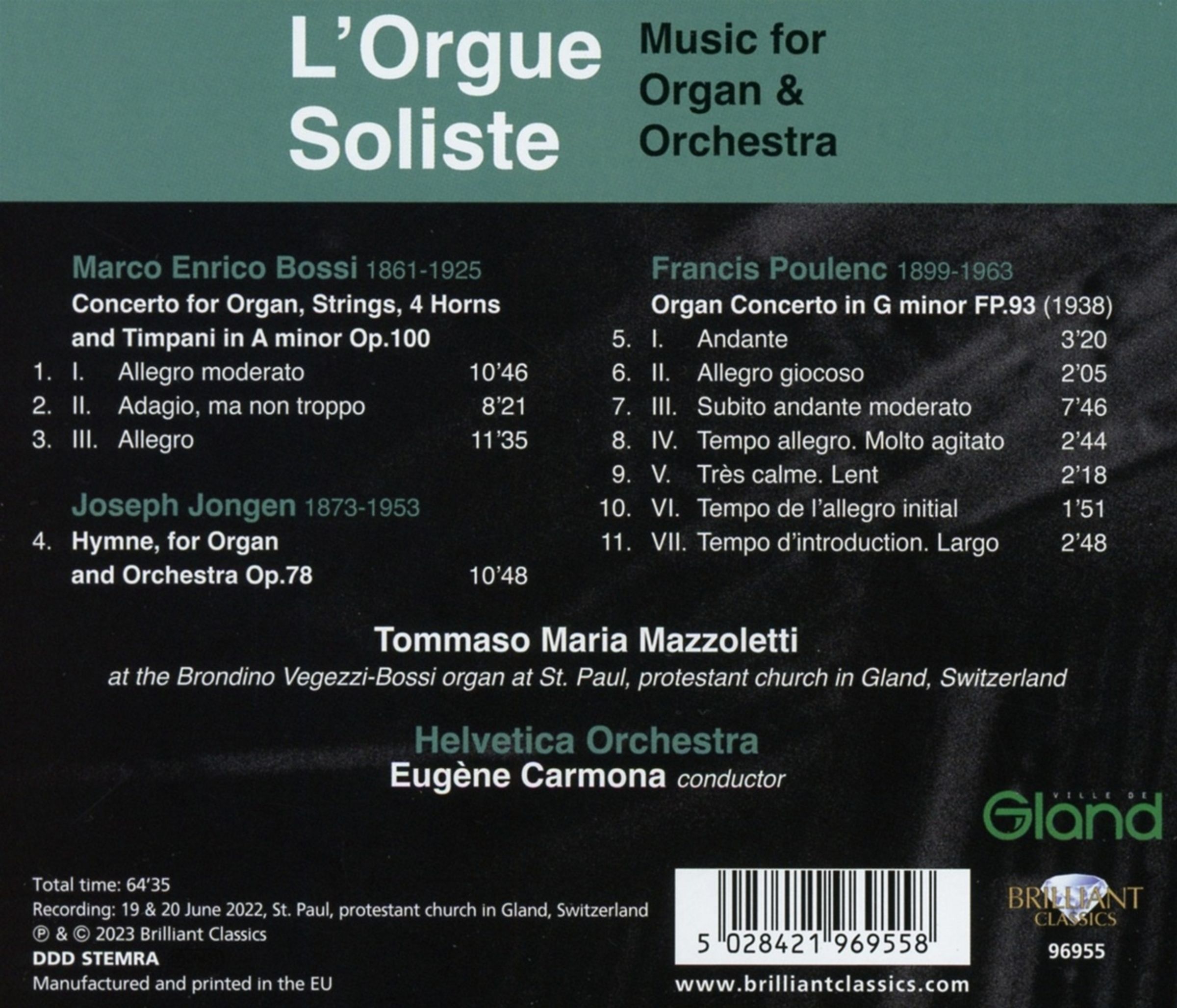 Die Orgel hat weniger eine »Solo«-Rolle als in den Werken von Bossi und Poulenc; vielmehr fügt sie sich in die warmen Texturen des Orchesters ein, als integraler Bestandteil des klanglichen Gesprächsflusses, der so typisch für Jongens impressionistisches Idiom ist. Auch hier sind die Komposition der Gland-Orgel und ihr überaus voller, warmer und poetischer Klang ein ideales Schaufenster für die geheimnisvolle Atmosphäre dieses Werks.