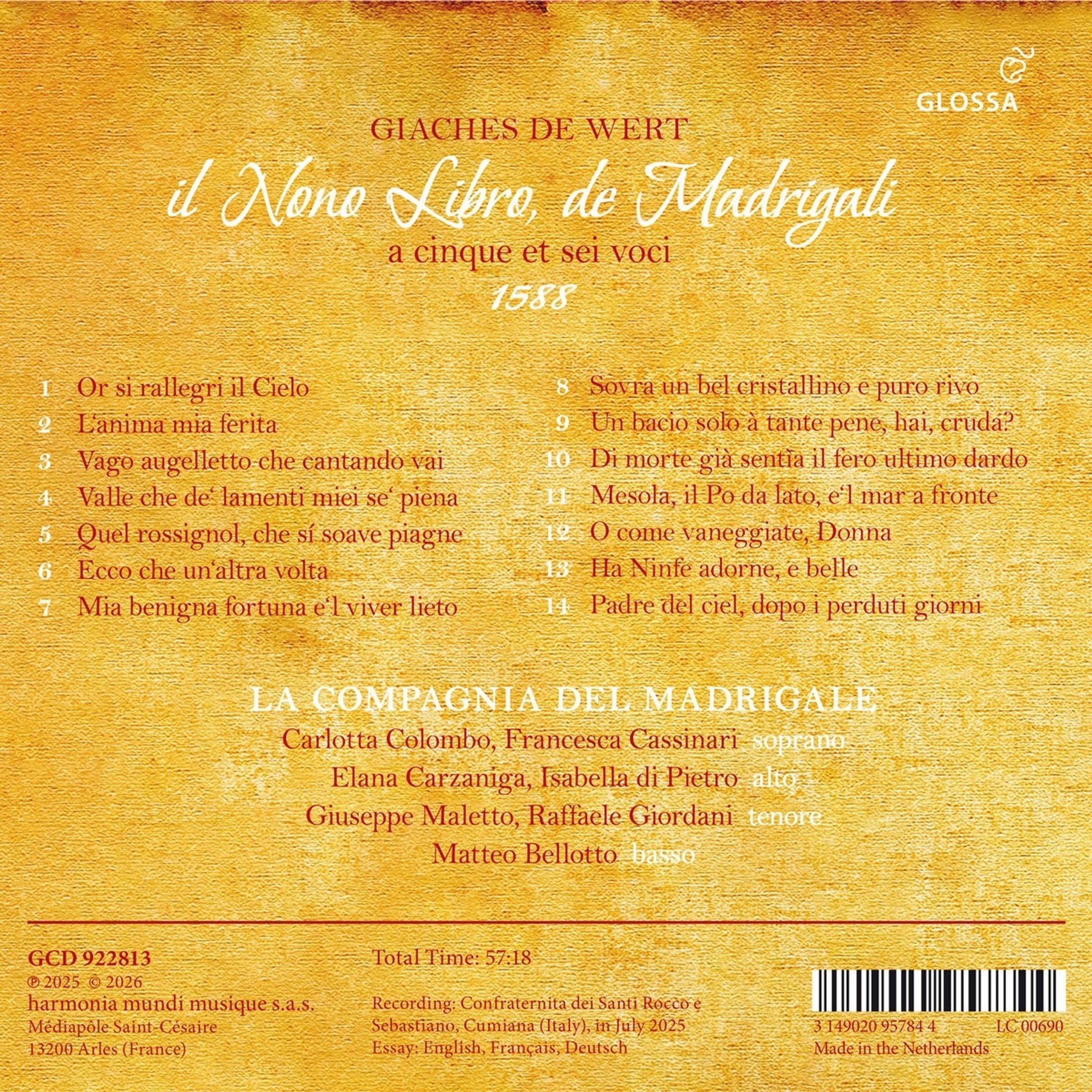 Der Flame Giaches de Wert war fast sein ganzes Leben lang in Italien am Hof der Gonzaga in Mantua tätig. Er war einer jener großen Komponisten, die in der Lage sind, Moden zu überwinden und Kunst zu schaffen, die dazu bestimmt ist, »beständig und ewig« zu bleiben. Das Neunte Madrigalbuch, 1588 in einer Zeit persönlicher Not und des Schmerzes über die vereitelte Liebe zur Dichterin Tarquinia Molza veröffentlicht, markiert einen Höhepunkt an Kunstfertigkeit und Pathos. Wert erkundet Petrarcas Canzoniere neben Versen von Torquato Tasso, Jacopo Sannazaro und Battista Guarini. Er wechselt zwischen leuchtenden höfischen Hommagen und einer innovativen Lyrik, die den Stil von Carlo Gesualdo vorwegnimmt.
