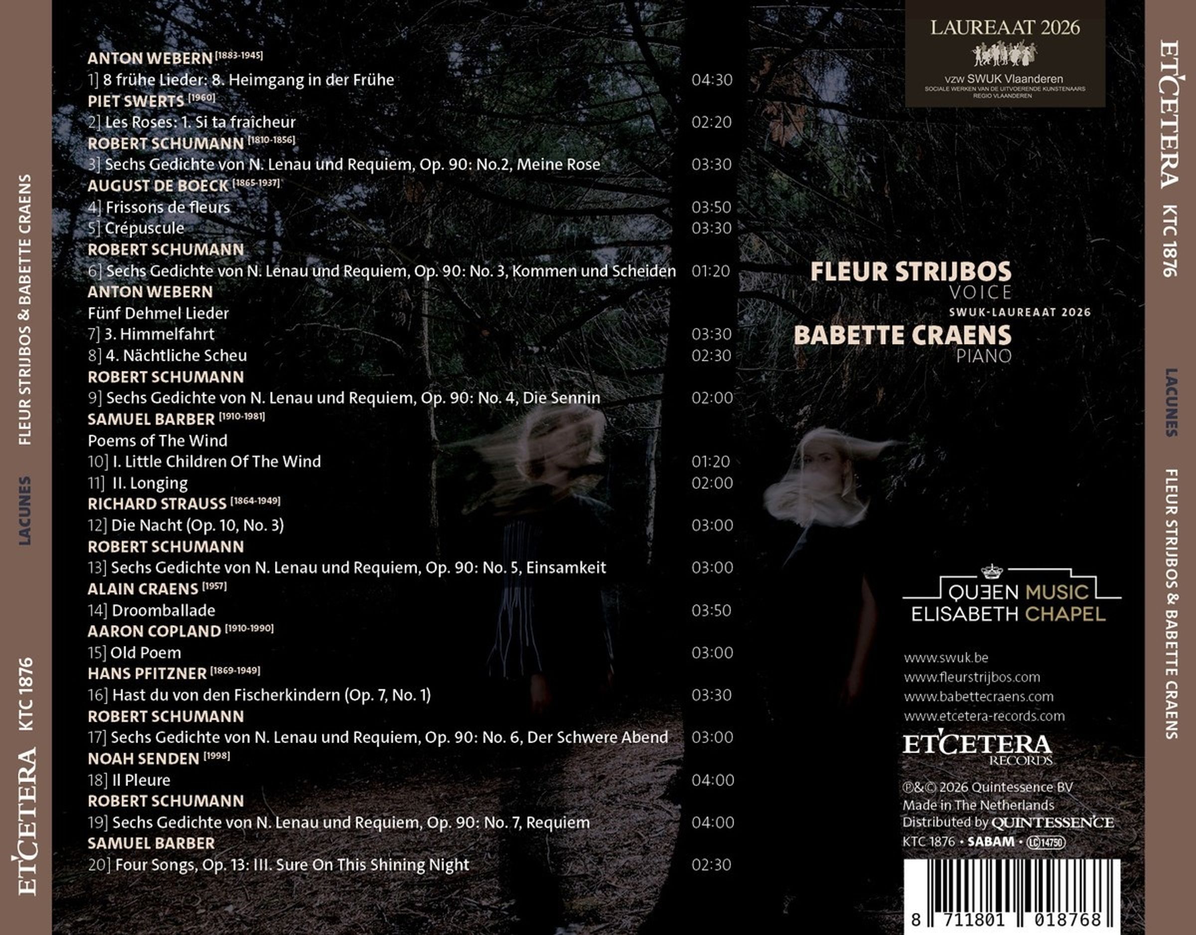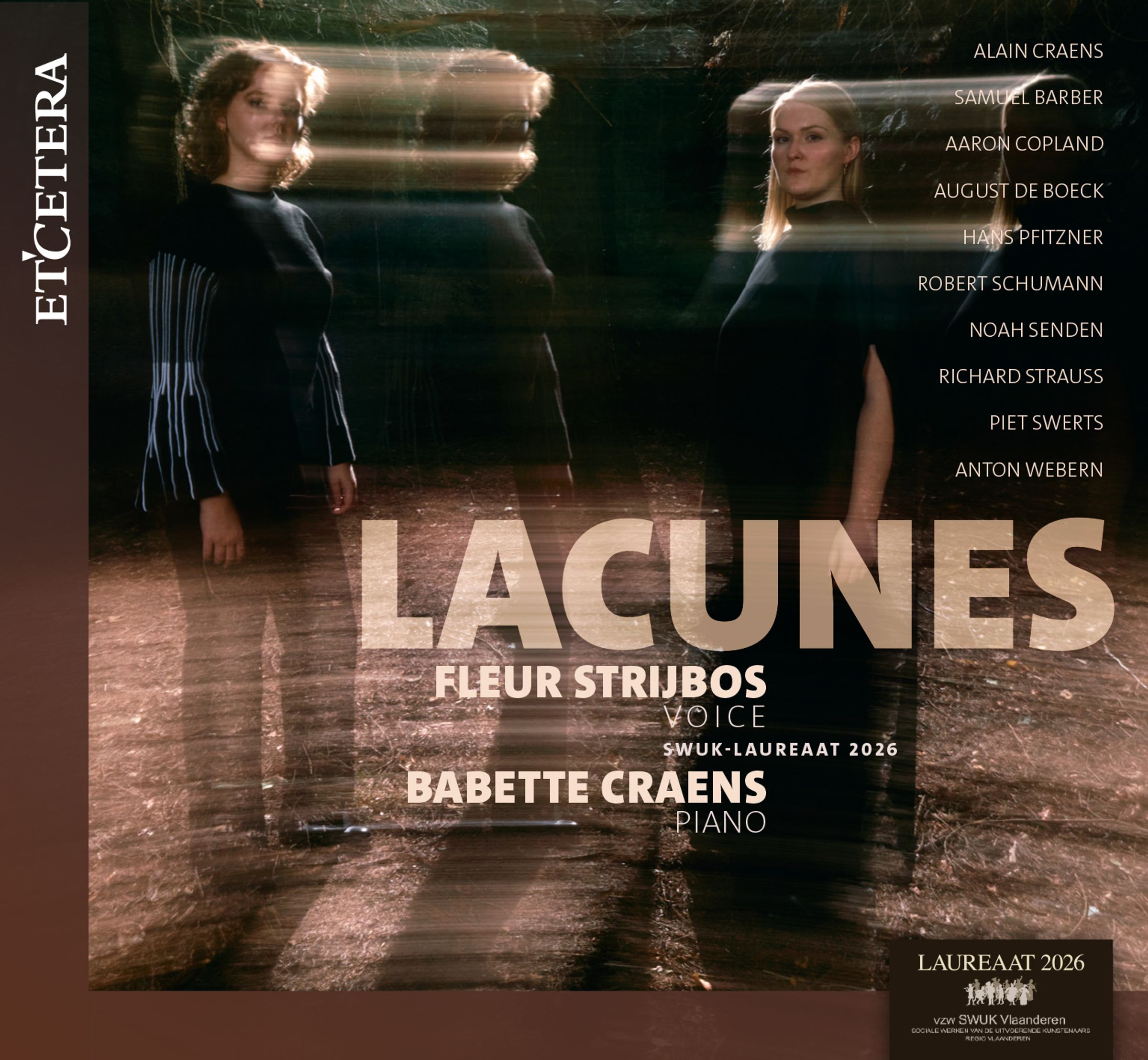 Die Sängerin Fleur Strijbos und die Pianistin Babette Craens verbindet die Faszination für Robert Schumann und seinen Zyklus „Sechs Gedichte von Nikolaus Lenau und Requiem“, der den Rahmen des Programms bildet. Lenaus Gedichte atmen Verlust und Sehnsucht, in Schumanns Kompositionen wechseln Zartheit und Verzweiflung. Der Titel „Lacunes“ (Lücken) steht für die zerbrechliche Schönheit des Verlangens und das Bewusstsein, dass in der Abwesenheit selbst etwas zutiefst Vertrautes liegt. Pfitzner und Strauss bilden eine Brücke zwischen Spätromantik und 20. Jahrhundert. Von der zarten Melancholie des frühen Webern führt die Reise zu den offenen, transparenten Klangwelten von Copland und Barber.