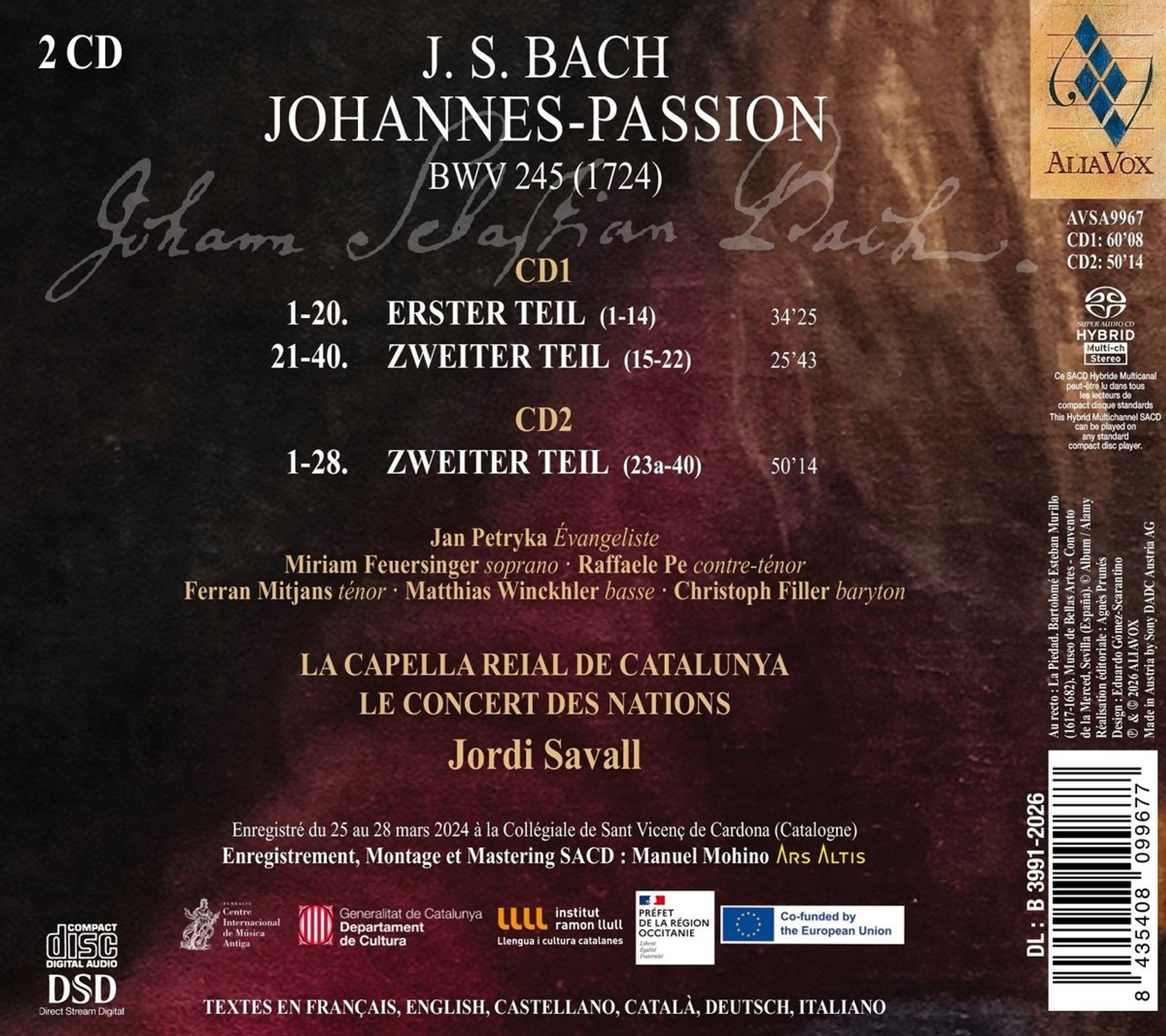 - Jan Petryka, Miriam Feuersinger, Raffaele Pe, Ferran Mitjans, Christoph Filler, Matthias Winckhler, La Capella Nacional de Catalunya, Le Concert des Nations, Jordi Savall