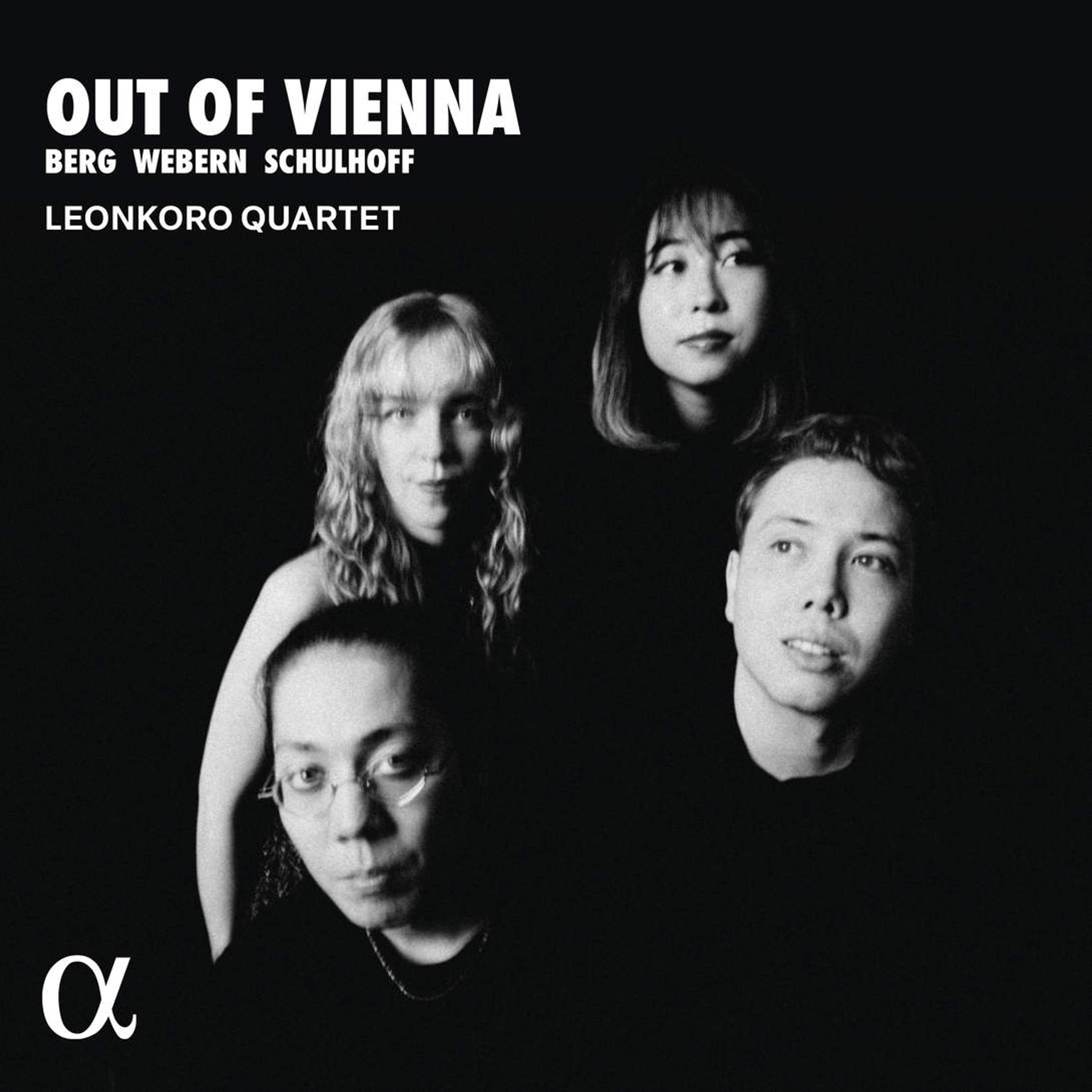 Texte: "OUT OF VIENNA", "BERG WEBERN SCHULHOFF", "LEONKORO QUARTET". Schwarz-weiß Foto von vier Personen mit neutralem Ausdruck., CD