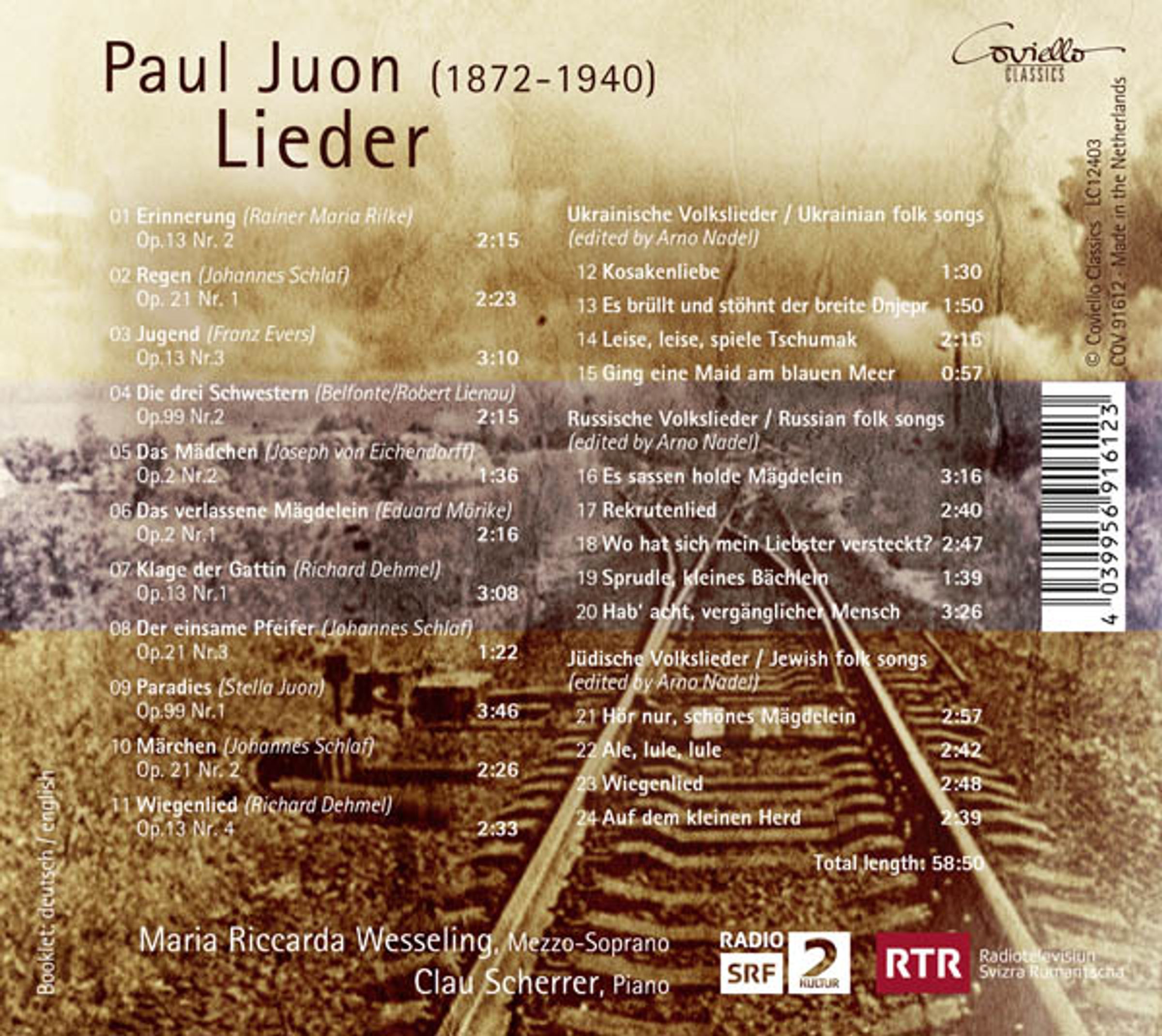Obwohl Paul Juon immerhin Zeitgenosse von Arnold Schönberg, Alban Berg und Anton Webern war, ist er doch klar der Spätromantik zuzuordnen. Seine Tonsprache zeichnet sich durch eine Verwendung russischer und nordischer Melodien aus, die er durch formale Mittel wie seltene Taktarten und ausgefeilte Harmonik zu Kunstmusik durcharbeitet. Ein Kritiker bezeichnete Juons Musik einmal als fehlendes Glied zwischen Tschaikowski und Strawinsky. Maria Riccarda Wesseling und Clau Scherrer stellen hier seine entdeckenswerten Lieder vor.
