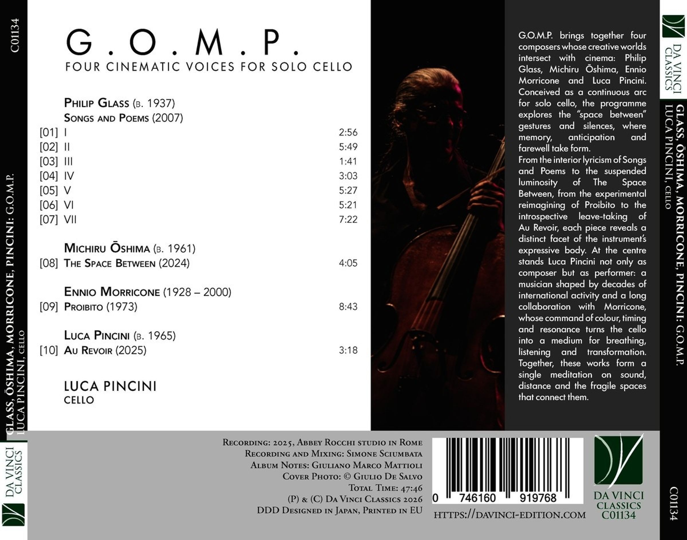 Unter der Abkürzung G. O.M. P. stellt der Cellist Luca Pincini ein Soloprogramm vor, dessen verbindendes Element der im Kino zu erfahrende Zwischenraum zwischen Personen und Klängen ist, wo nah an der Stille Nuancen von Zuneigung, Vorfreude und Erinnerung zum Vorschein kommen. Zwei der hier vorgestellten Werke gehen davon aus, dass gerade das „Dazwischen“ die Dichte der Bedeutung bewahrt und dass das Violoncello mit seiner dem menschlichen Atem ähnlichen Stimme diese in Klangmaterie umwandeln kann. Von der strengen Konzentration bei Philip Glass und der Leuchtkraft bei Michiru Ōshima über Ennio Morricones Klanglabor zum introvertierten „Au revoir“, einer Komposition des Cellisten.
