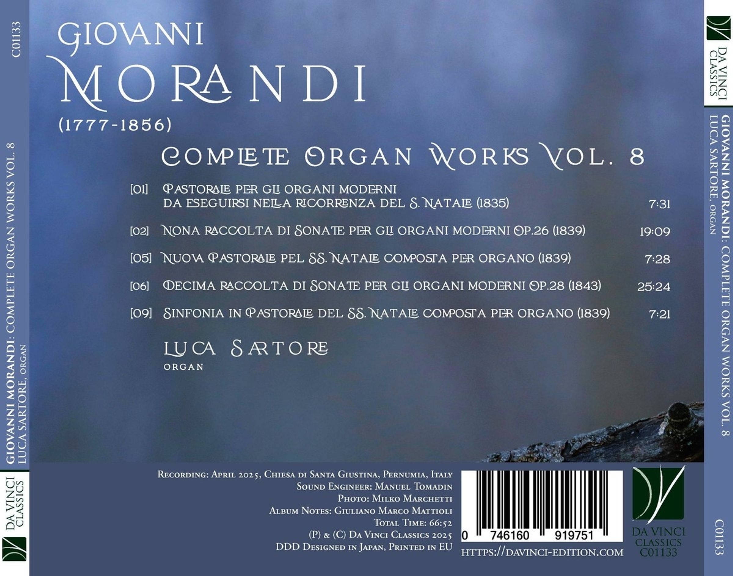 Der achte Band der Gesamteinspielung von Giovanni Morandis Orgelwerken beleuchtet die italienische Orgel des frühen 19. Jahrhunderts, die zwischen liturgischem Gebrauch, theatralischem Geschmack und der Erneuerung der Orgelmusik angesiedelt ist. Zwei weitere Sonatensammlungen für die moderne Orgel entfalten eine weite Klangpalette und ein fast orchestrales Raumgefühl, bleiben jedoch der Messe als formalem Rahmen unterworfen. Das Theater drängt sich nicht auf, sondern wird in rituelle Bahnen gelenkt. Daneben erklingen drei weihnachtlich inspirierte Werke: Pastorale, Nuova Pastorale und Sinfonia in Pastorale.