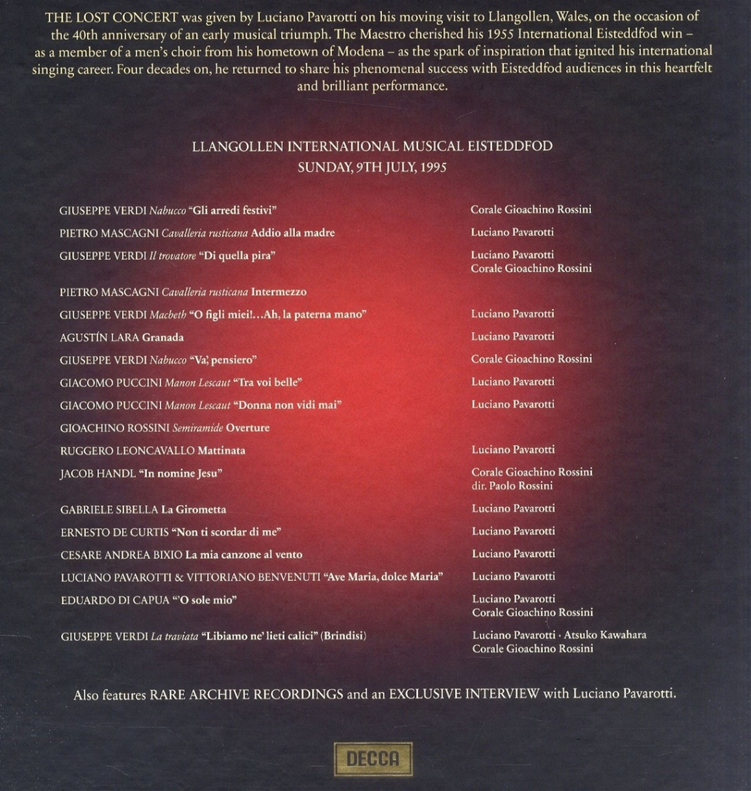 Im Juli 1955 reiste der damals 19-jährige Luciano Pavarotti zusammen mit seinem Vater und einem Chor aus Modena nach Wales, um am Llangollen International Musical Eisteddfod teilzunehmen. Dort gewannen sie den Wettbewerb der Männerstimmen mit großem Abstand. Dieser besondere Moment inspirierte Pavarotti, professioneller Sänger zu werden. 40 Jahre später, im Jahr 1995, kehrte er zurück, um während der Eisteddfod-Woche ein besonderes Konzert im Pavillon zu geben. Diese Aufnahme dokumentiert das bisher unveröffentlichte, historische Konzert.