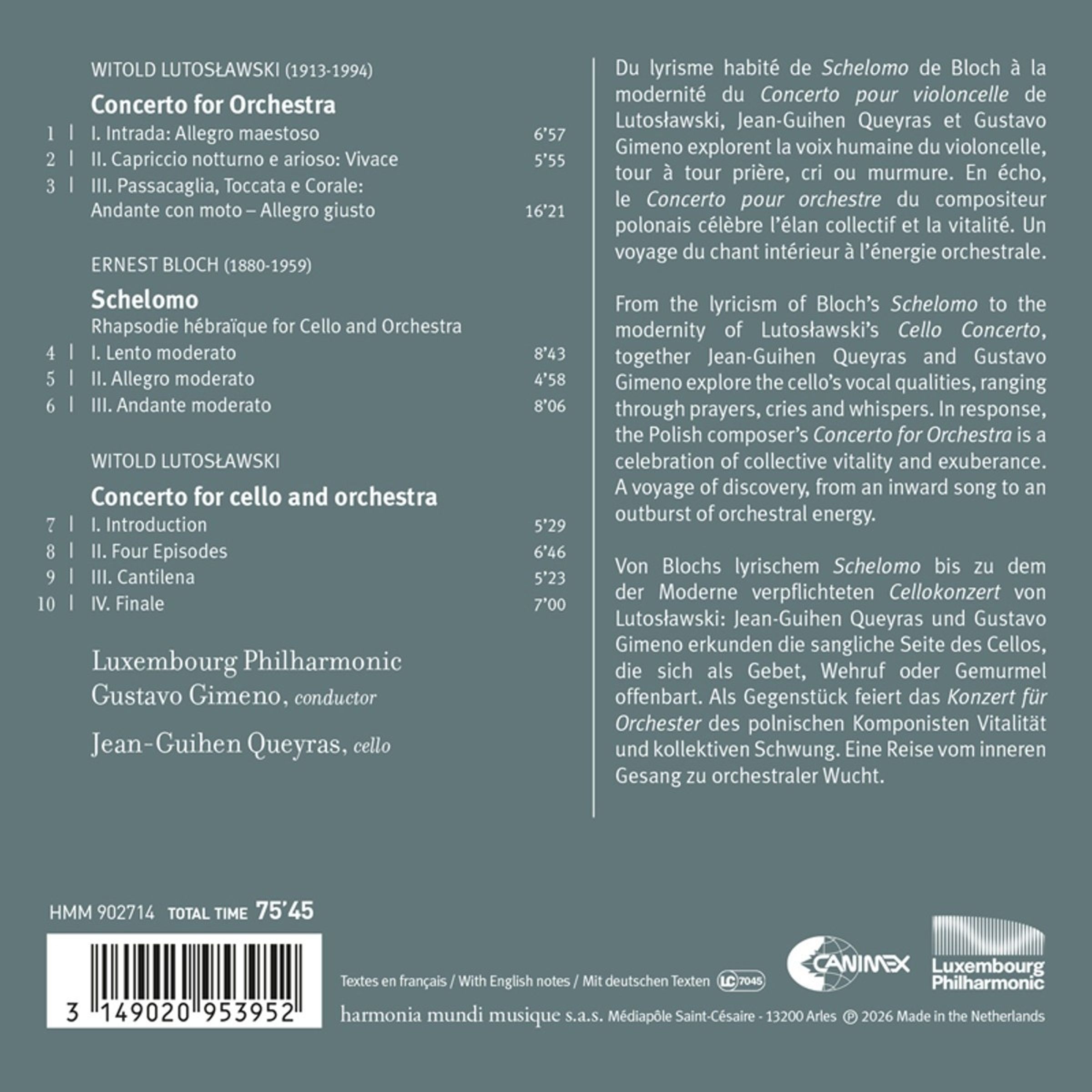 Von Blochs lyrischem Schelomo bis zu dem der Moderne verpflichteten Cellokonzert von Lutoslawski: Jean-Guihen Queyras und Gustavo Gimeno erkunden die sangliche Seite des Cellos, die sich als Gebet, Wehruf oder Gemurmel offenbart. Als Gegenstück feiert das Konzert für Orchester des polnischen Komponisten Vitalität und kollektiven Schwung: Eine Reise vom Inneren Gesang zu orchestraler Wucht.