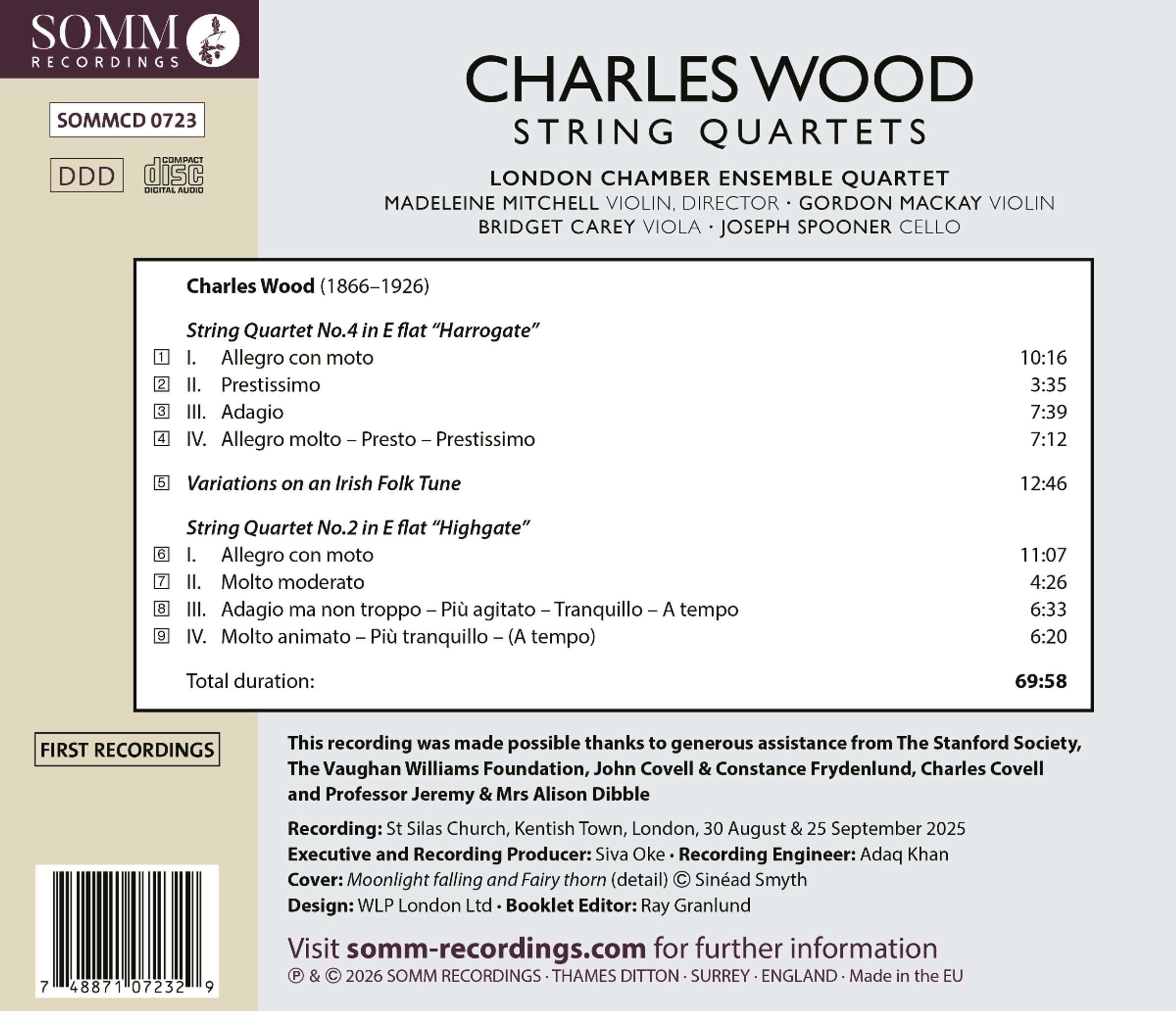 Anlässlich des 100. Todestages des in Irland geborenen Komponisten Charles Wood (1866 - 1926) erscheint die Weltersteinspielung seines Streichquartetts Nr. 2 "Highgate" und seines Streichquartetts Nr. 4 "Harrogate" zusammen mit seinen "Variationen über eine irische Volksweise". Dies folgt auf die Veröffentlichung von Woods sechstem und letztem Streichquartett in einer Aufführung durch das London Chamber Ensemble Quartet. Das London Chamber Ensemble, das auch auf diesem Album vertreten ist, wurde 2019 gegründet und wird von der Geigerin Madeleine Mitchell geleitet. Das Ensemble wurde für sein 'leidenschaftliches und überzeugendes Eintreten [und] fesselnde Interpretationen' (Gramophone) gelobt. Charles Wood wurde in eine Familie von Sängern und Musikern in Armagh, Irland, geboren. Er sang im Chor der Kathedrale, wurde als Student Organist und sammelte Erfahrungen als Streicher, insbesondere als Bratschist. Im Alter von sechzehn Jahren begann Wood, Kammermusik zu schreiben. Ein Jahr später wurde er eines der fünfzig Gründungsmitglieder des Royal College of Music und studierte Komposition bei Sir Charles Villiers Stanford und Sir Hubert Parry. Wood unterrichtete seinerseits Ralph Vaughan Williams, Samuel Coleridge Taylor, Herbert Howells und Michael Tippett. Zwei Jahre nach seinem Studienabschluss 1890 komponierte Wood ein zweites Streichquartett, dem er den Spitznamen "Highgate" gab (vermutlich nach Besuchen bei seinem Bruder an der Highgate Grammar School). Obwohl das Streichquartett ein wenig an Brahms erinnert, zeigt es doch Woods aufkommende Individualität. Der ungewöhnliche dritte Satz beispielsweise verwendet einen siebentaktigen Grundbass in Verbindung mit einem strengen Thema für sein eigenes Instrument, die Bratsche. 1912 unternahm er eine Reise, die ihn nach Harrogate führte und vollendete bald sein viertes Quartett - daher der Spitzname. Woods verwendet irische Volksmelodien und Tanzmelodien als thematisches Material, wie etwa in dem fesselnden, reelartigen Rondothema seines Finales.