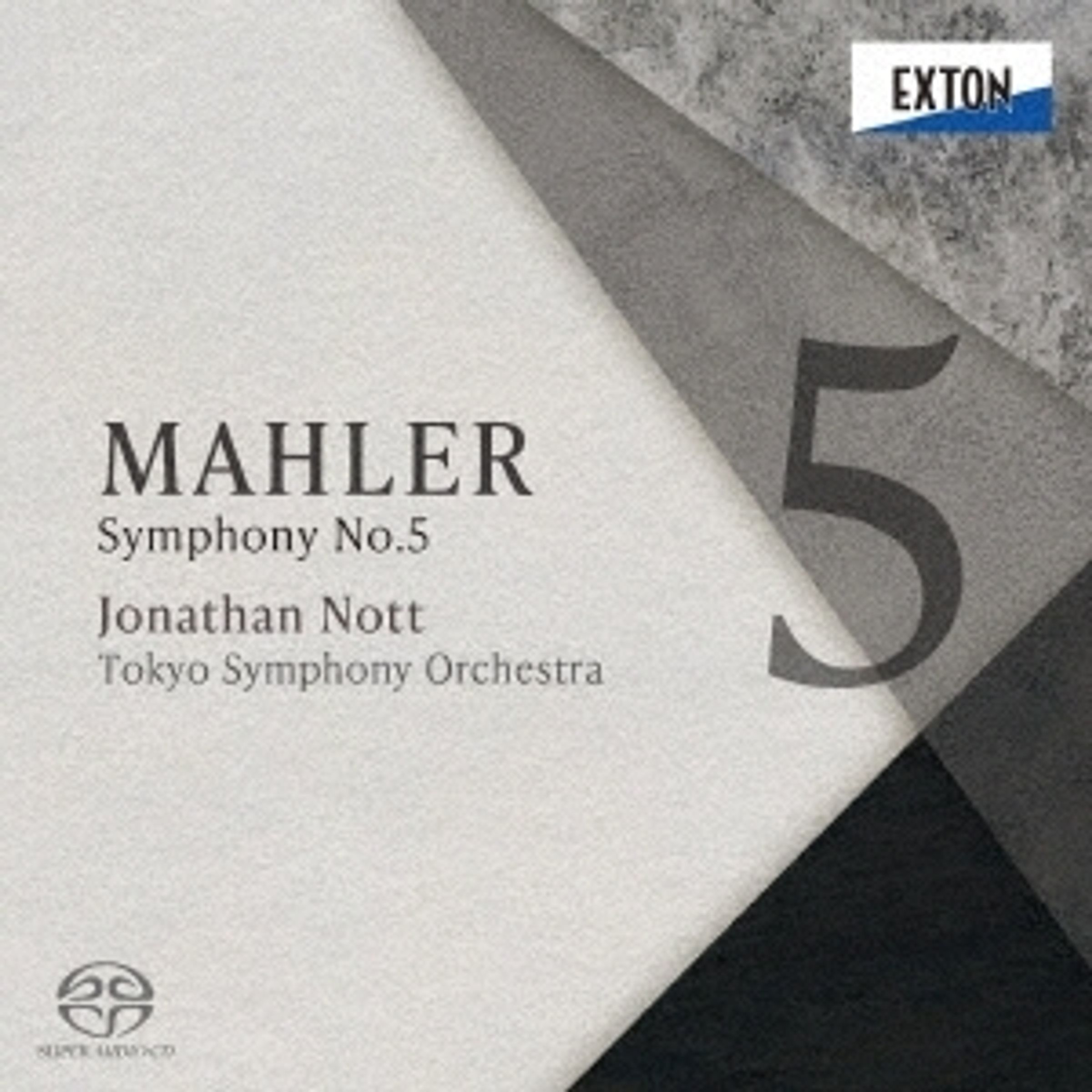 „MAHLER Symphony No.5 Jonathan Nott Tokyo Symphony Orchestra“. Logo oben rechts „EXTON“. Abstrakte graue Formen., Super Audio CD