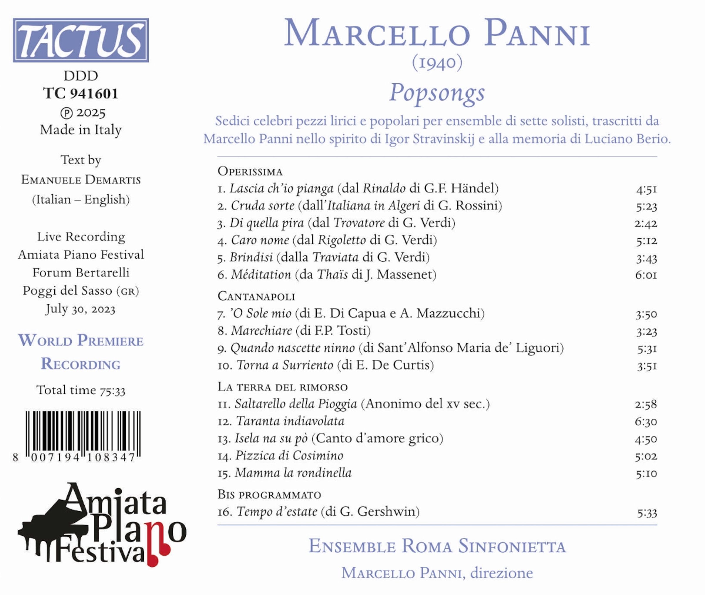 Der Begriff "Popsongs" ist eine Mischung aus den beiden englischen Wörtern "popular" (im Sinne von "beliebt" und "gefeiert") und "songs" (im Sinne von "Lieder") und unterstreicht die Absicht, Zugänglichkeit mit der Eleganz raffinierter Kompositionsformen zu verbinden. Diese Sammlung von sechzehn Instrumentalstücken, die Marcello Panni zwischen 2013 und 2015 während seiner Tätigkeit als Dirigent des Sinfonieorchesters "Tito Schipa" in Lecce für die Solistengruppe Ensemble del Sud komponierte, ist eine leidenschaftliche und spielerische Hommage an die berühmtesten Melodien der italienischen Musiktradition, sowohl aus der Oper als auch aus der Volksmusik. Dieses Projekt zeichnet sich nicht nur durch die außergewöhnliche künstlerische Qualität seiner Orchestrierung aus, sondern auch durch seine Fähigkeit, den illustren Vorbildern der Musikgeschichte des 20. Jahrhunderts Tribut zu zollen und sich von ihnen inspirieren zu lassen. Eine wesentliche Referenz sind Luciano Berios "Folk Songs" aus dem Jahr 1964, mit dem Panni viele Jahre lang eng befreundet war und zusammenarbeitete. Ein weiterer Bezugspunkt fur "Popsongs" ist Igor Strawinskys berühmte "Histoire du Soldat". Diese Komposition, ebenfalls für ein Septett geschrieben (Violine, Kontrabass, Klarinette, Fagott, Kornett, Posaune und Schlagzeug, das gleiche Ensemble, das auch Panni verwendet), ist ein bemerkenswertes Beispiel für Kammermusik, die Erzählkunst, Theatralik und eine bemerkenswerte Verschmelzung verschiedener Musikstile vereint.