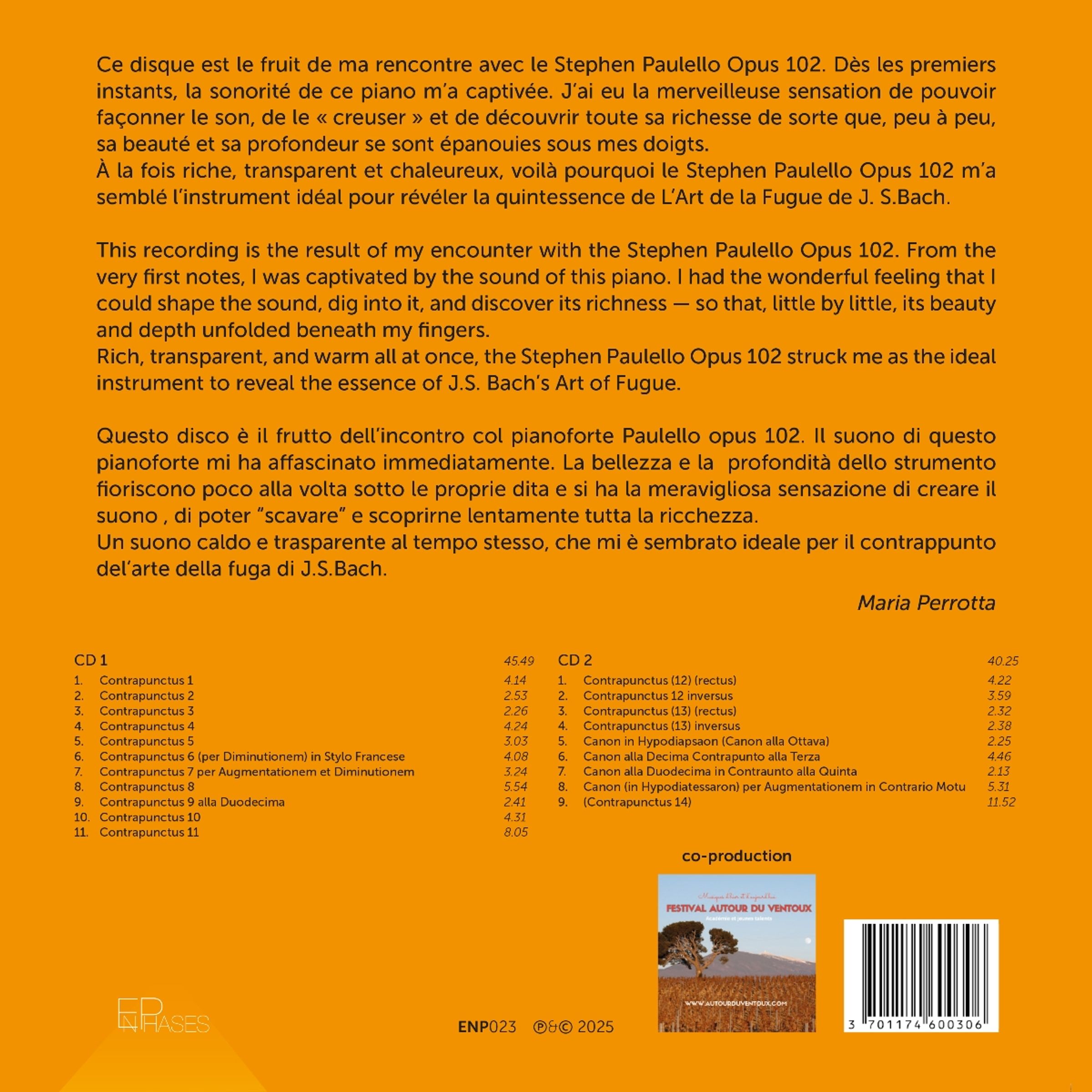 Seit fast 30 Jahren baut der ehemalige Pianist Stephen Paulello besondere Klaviere und begeistert damit zahlreiche Musiker. Die Pianistin Maria Perrotta entdeckte einen Flügel das Klavierbauers Stephen Paulello und sagt dazu: "Diese Aufnahme ist das Ergebnis meiner Begegnung mit dem Stephen Paulello Opus 102. Von den ersten Tönen an war ich vom Klang dieses Klaviers fasziniert. Ich hatte das wunderbare Gefühl, dass ich den Klang formen, mich in ihn vertiefen und seine ganze Fülle entdecken konnte - so dass sich seine Schönheit und Tiefe nach und nach unter meinen Fingern entfaltete. Mit seinem zugleich vollen, transparenten und warmen Klang erschien mir das Stephen Paulello Opus 102 als das ideale Instrument, um die Essenz von J. S. Bachs Kunst der Fuge zum Ausdruck zu bringen."